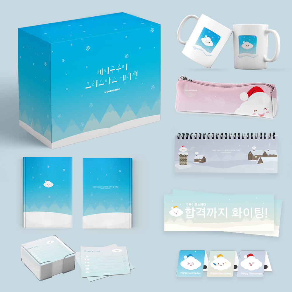 지난 2018년 말, 구루미 캠스터디 이용자들을 대상으로 진행 한 크리스마스 이벤트를 위해 출시한 '해피구루미 크리스마스 에디션'은 실제 구루미 캠스터디 이용자들이 필요로 할 만한 다이어리, 필통, 위클리 플래너, 메모지, 북마크 등의 구성품으로 이루어졌다. 나의 공부 이야기 또는 다양한 공부 관련 에피소드 등을 자유롭게 작성하여 폼을 제출하면 응모되는 방식으로, 12월 초중순 약 2주간 진행되어 12월 20일부터 25일에 선물이 전달되었다. 또 구루미 캠스터디는 이후 2019년까지도 이용자들을 위해 서비스를 무료로 제공했으며, 지금도 일부 기능만 프리미엄화 시켜 저렴한 요금제로 운영하고 있다.