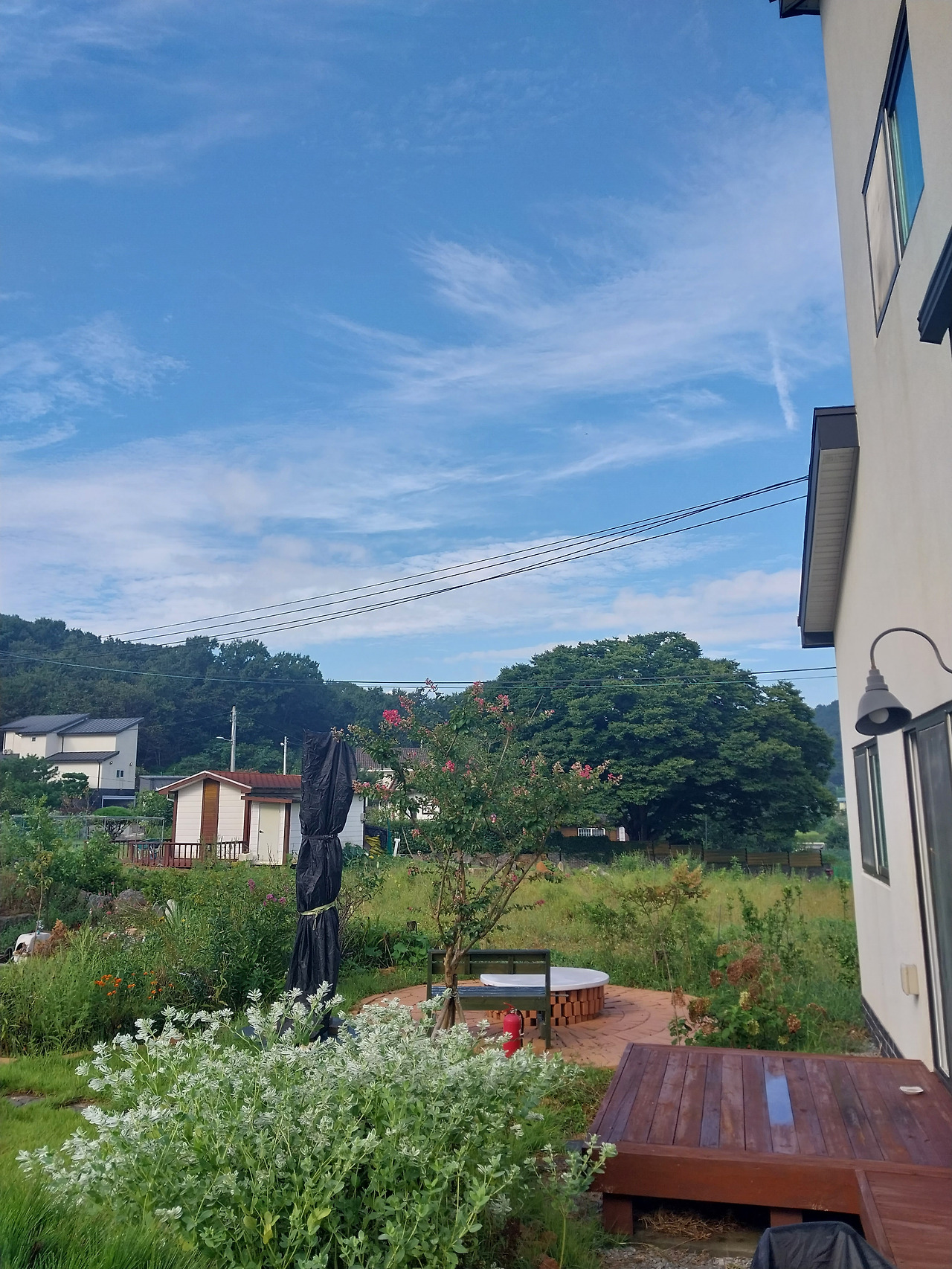 버스에 승객은 나 하나뿐이었다. 기사님은 단 한 명의 손님인 나를 위해 내가 자리에 앉을 때까지 버스를 출발시키지 않으셨다(내가 넘어질까 봐). 내가 자리에 앉자마자 다시 출발하셨고 그 버스는 내가 타고 있는 내내 단 한 명의 손님도 없이 목적지까지 무사히 나를 데려다주었다. 버스에서 내려 북스테이까지 찾아가는 길도 길치인 내게는 그리 순탄하지만은 않았다. 하필 비까지 내리고 있어 길이 진흙탕이 돼버리긴 했지만 비포장도로 시골길이 주는 자연스러움이 그리 싫지만은 않았다. 한참을 걸어가다 웅성거리는 사람들 덕분에 하늘을 예쁘게 수놓은 무지개도 발견할 수 있었고 사진으로 담으며 기분 좋은 미소를 짓기도 했다. 모든 게 느리게 흘러가는 것만 같은 이 동네의 시간이 참으로 평화롭고 좋았다. 겨우 도착한 숙소는 내가 생각한 것 이상으로 조용하고 아늑한 공간이었다. 나를 계속 기다리고 계셨던 사장님은 반가운 얼굴로 나를 맞이해주셨다. 실내 슬리퍼로 갈아 신고 사장님과 함께 숙소의 이곳저곳을 구경하며 귀여운 고양이 가족도 소개받았다.