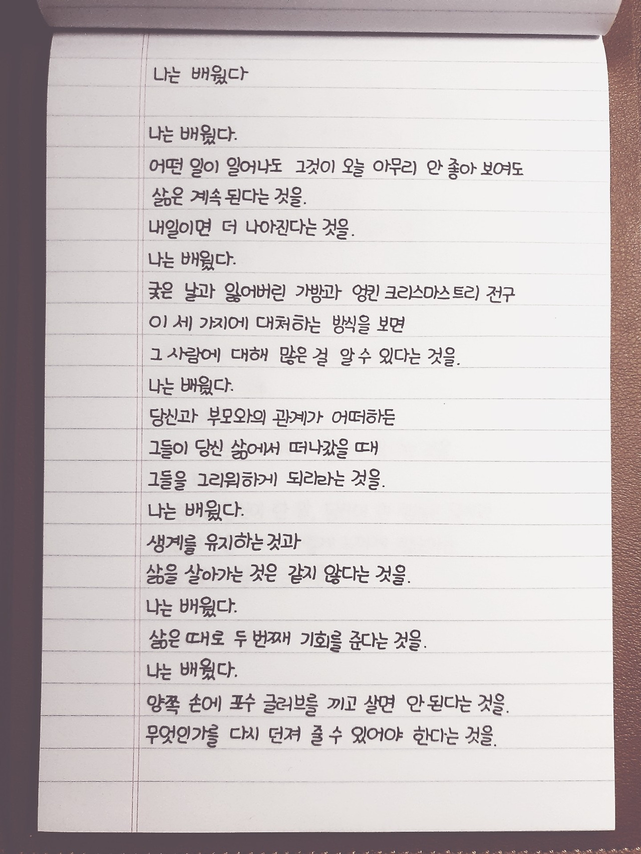 이 시는 배움이란 무엇인가를 생각해 보게 되는 시다. 나의 삶에 배움이란 나를 성장시키는 중요한 가치이기 때문에 더 공감하며 읽었는지도 모르겠다. 시의 첫 시작처럼, 어떤 일이 일어나고 그 일이 좋은 일이든 나쁜 일이든 삶은 계속된다는 것을 배우게 되는 것 같다. 그 과정에서 끊임없이 성장하는 것이 우리의 삶이지 않을까.