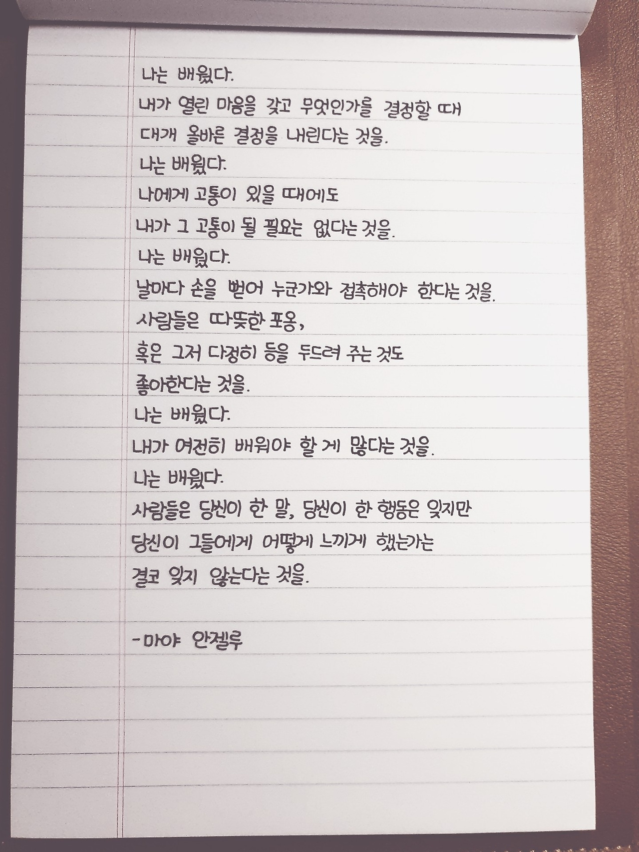 오늘 소개할 시도 당시 내가 좋아했던 시 중 하나인 마야 안젤루의 '나는 배웠다'라는 시이다. 마야 안젤루는 토니 모리슨, 오프라 윈프리와 함께 미국의 가장 영향력 있는 흑인 여성이자 시인으로, 16세에 미혼모가 되어 아이를 키우기 위해 식당 조리사, 웨이트리스, 나이트클럽 가수, 자동차 정비공을 전전하다가 자전적 소설을 발표하며 문학사에 한 획을 그었다고 한다.