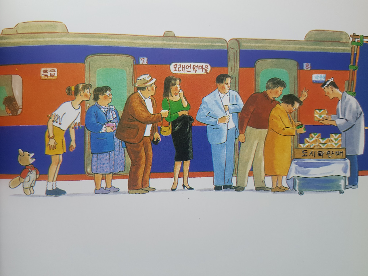 맨 끝에 선 푹신이의 까치발과 줄 선 어른들의 행동(지갑을 열고, 손가락을 펴 보이는 등)으로 시간의 촉박함이 드러납니다. 도시락 사려다가 기차를 놓칠지도 모르겠다는 불안감이 들지요.