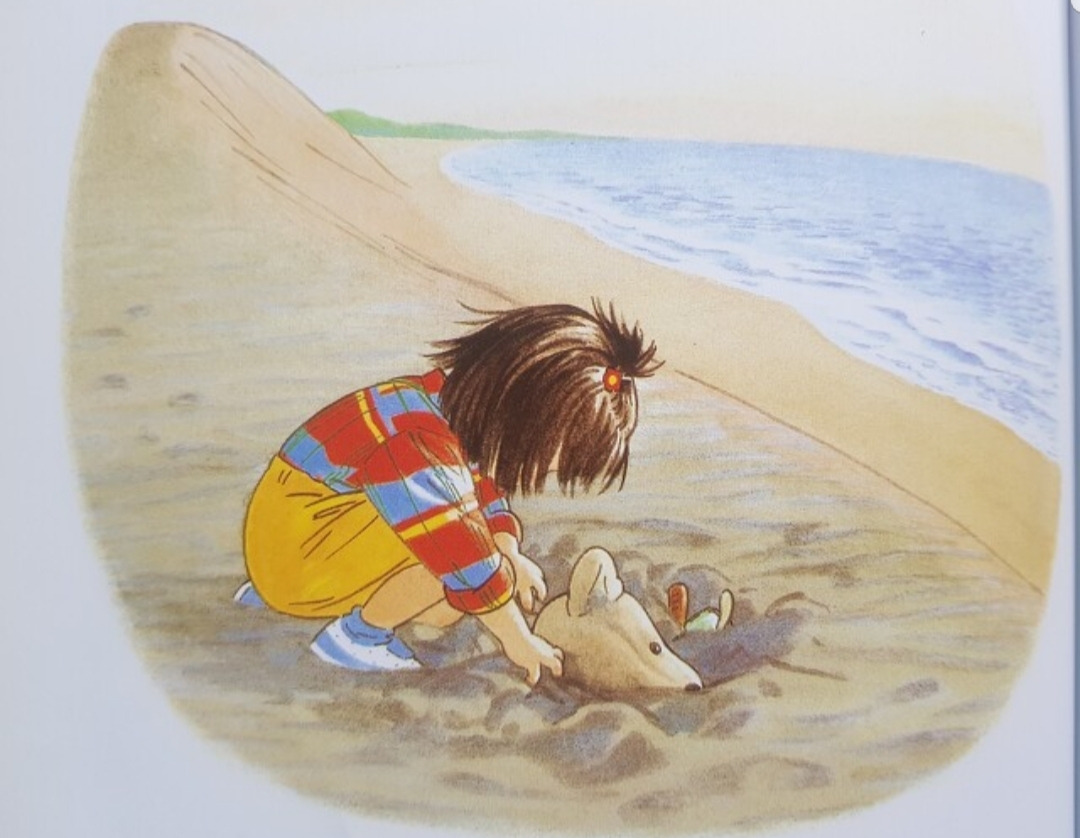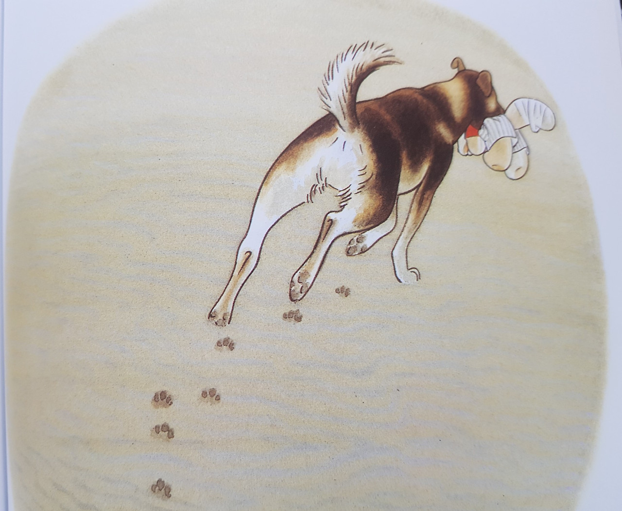 은지는 개의 뒤를 쫓아 모래 언덕까지 올라가서 푹신을 발견해요. 거의 만신창이가 되어 모래에 파묻힌 푹신이의 모습입니다.