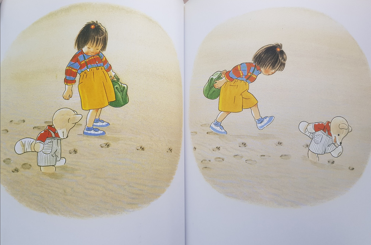 이후 은지가 자라나면서 푹신이와 늘 함께하는 과정을 보여 줍니다. 매일 붙어 다니다 보니 어느 날 푹신이 팔의 실밥이 터집니다. 터진 팔을 꿰매기 위해 모래 언덕 마을에 가기로 하지요.