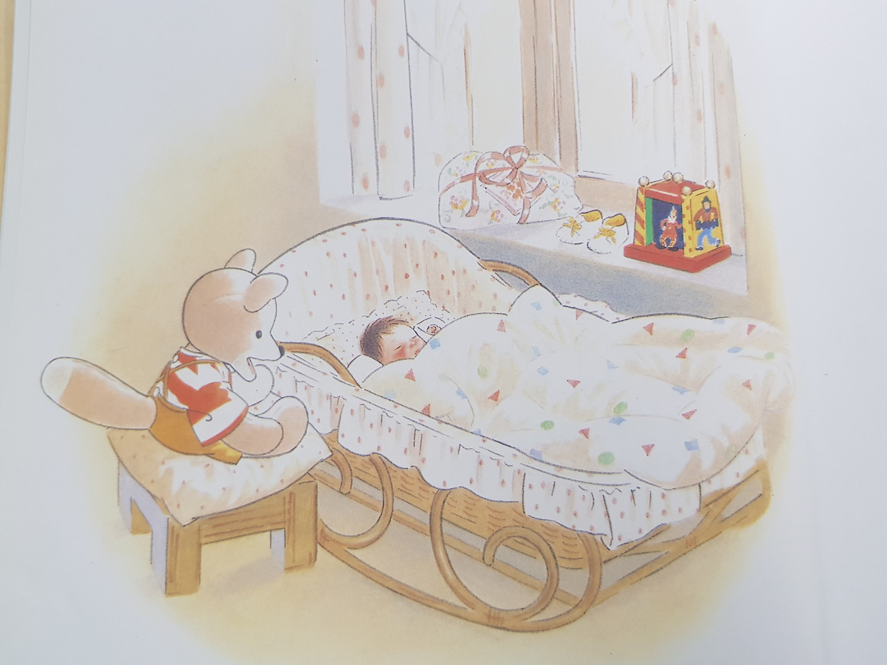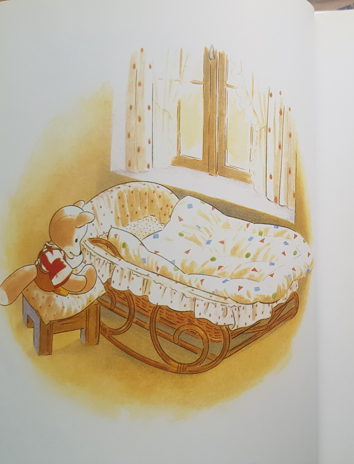 아직 태어나지 않은 아기 은지를 기다리는 푹신이의 지루한 모습이 보이죠. 고개를 숙인 채 입을 다물고 있고 귀와 꼬리는 쳐져 있습니다. 빈 침대만 바라보며 지친 거죠.