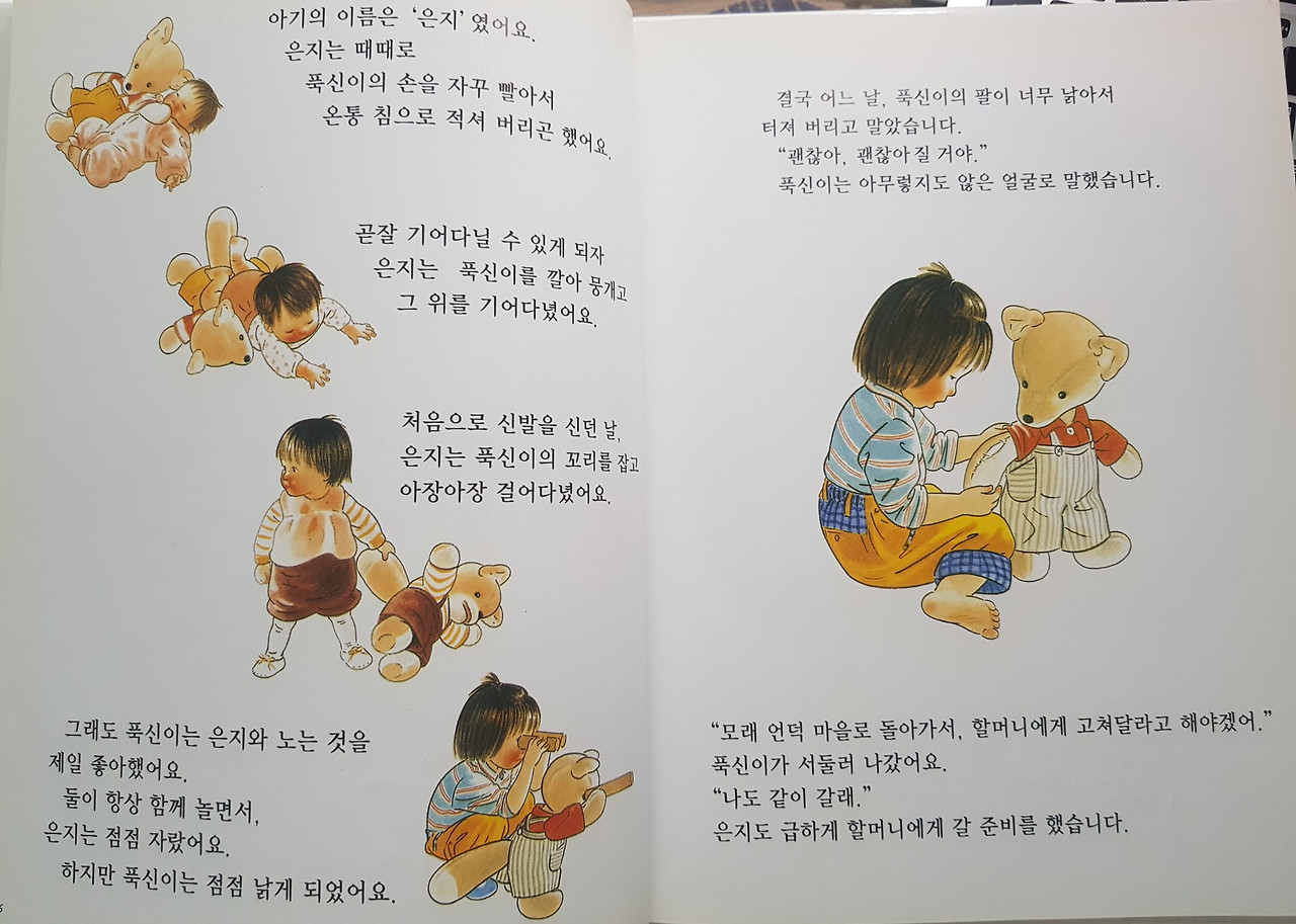 그 속에서 예상치 못한 사건들이 일어납니다. 그 사건을 통해서 은지와 푹신이는 변화를 겪게 되지요. 책 한 권 안에서 아이와 인형과 어른의 감정 변화가 물 흐르듯 잔잔하게 펼쳐집니다. 한번 따라가 보실까요.