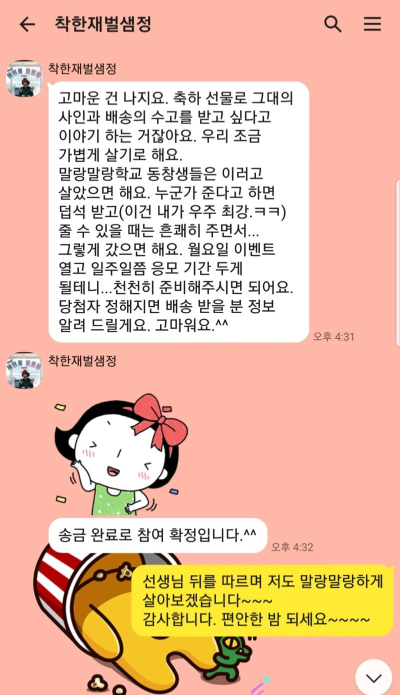 가끔씩 혼자 생각해 본다. 내가 대체 뭐라고. 착한재벌샘정님처럼 시간을 분 단위, 초 단위로 나눠 사시는 바쁜 선생님이 꼬박꼬박 잊지 않고 카톡을 보내 주실까? 하고 말이다.