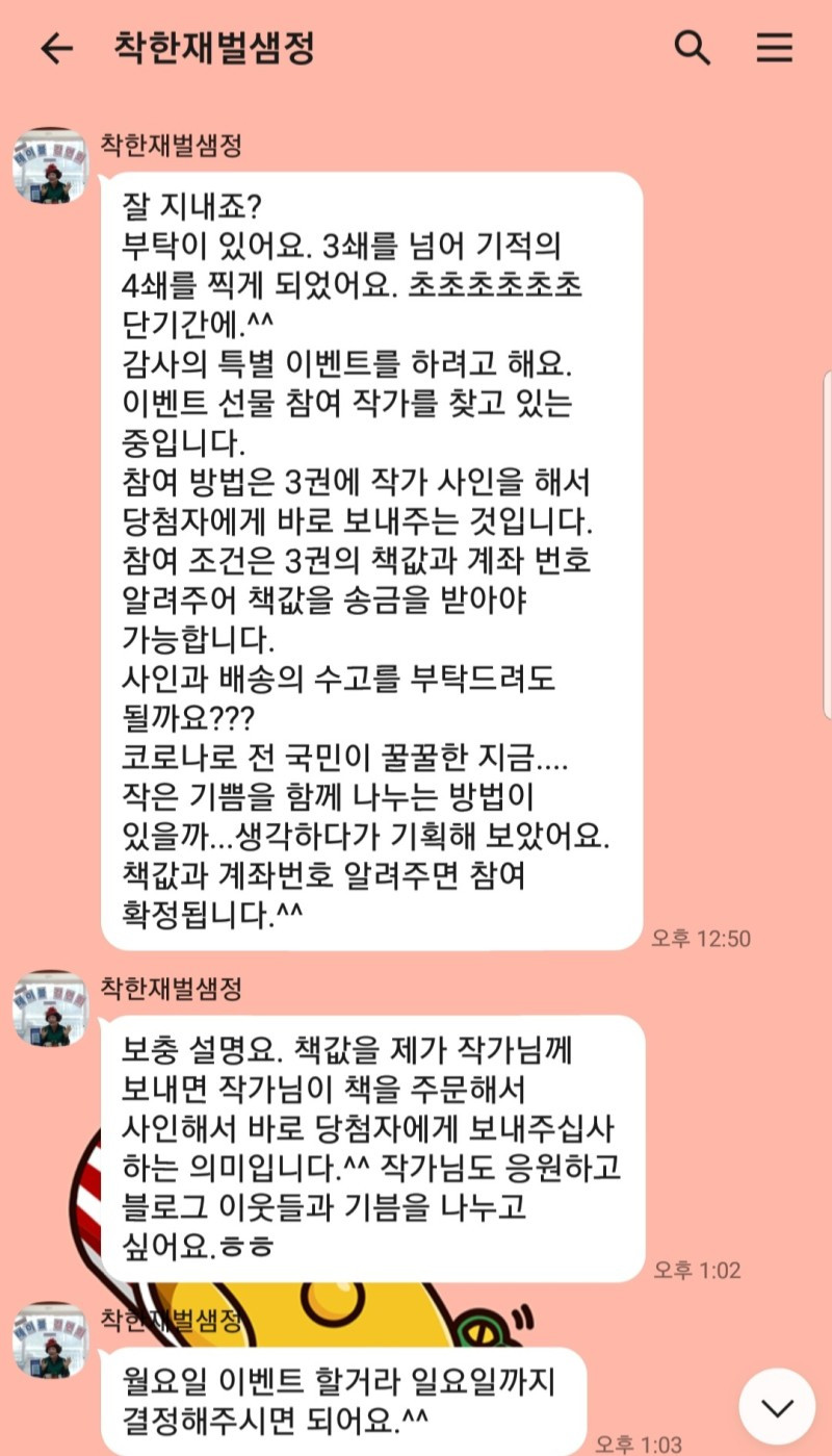 그 기쁨을 착한재벌샘정. 선생님만의 방식으로 풀어내신다. 본인과 인연이 닿은 작가 10명의 책을 3권씩 구입하여서 각 저자의 사인 후 희망자에게 택배로 보내는 이벤트를 진행 중이시다.