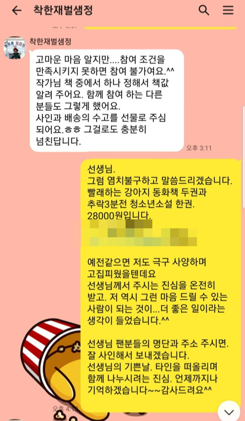 그 작가 중 한 명이 내가 됐다. 내 책을 누군가에게 보낸다면 당연히 내가 구입해서 사인 후 선물로 보내겠다고 말씀드렸지만 선생님은 극구 사양하신다. 결국 내 통장으로 돈을 입금하셨다. 그 돈을 안 받으면 이벤트 참여 작가가 될 수 없다는 조건을 확실히 하셨다.