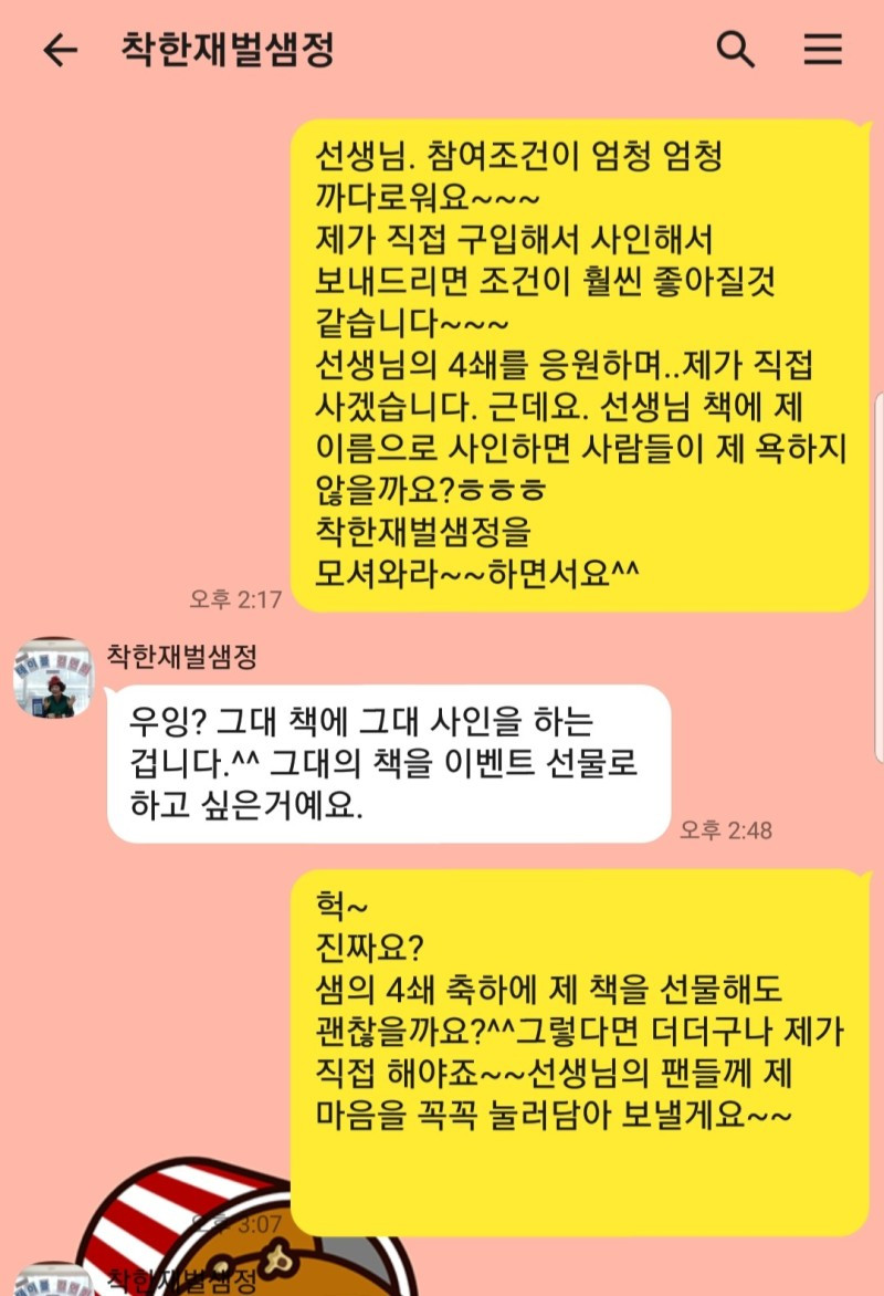 내가 책을 쓴다는 것을 아는 친구와 친척과 주변인들이 있지만 그들 중 대다수가 내가 쓴 책을 읽지 않는다. 친한 것과 책을 읽는 것은 별개라고 생각하는 사람들이 많은 세상에서 처음 만난 사람의 책을 굳이 찾아서 그 바쁜 시간을 쪼개고 쪼개서 읽는다는 건. 착한재벌샘정이라는 사람이 어떤 사람인지 알 수 있게 해주는 대목이다.