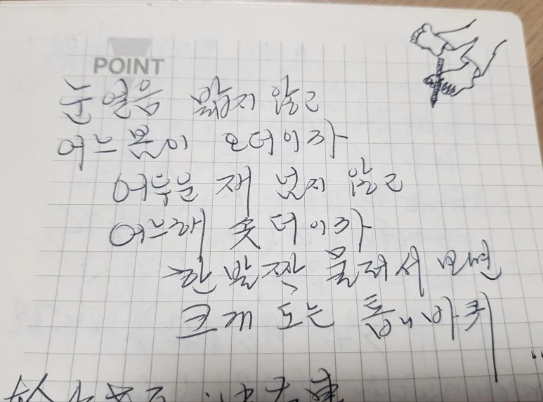 아버지가 출처를 밝히지 않고 써놓은 시는 장순하 시조시인의 시 일부이다. 당시만 해도 저작권에 대한 이해도가 높지 않았을 테니 어디선가 좋은 글귀를 보고 따라 적어 놓은 것 같다.
