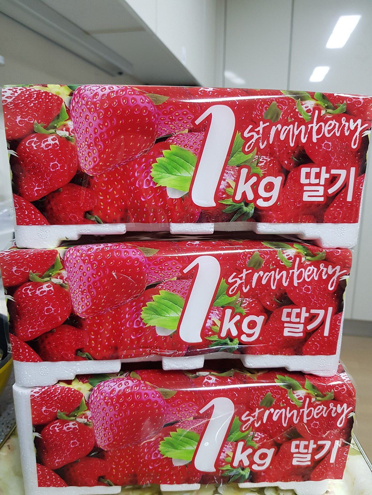 퇴근길 마트에서 1킬로 그램 짜리 딸기 세 박스와
