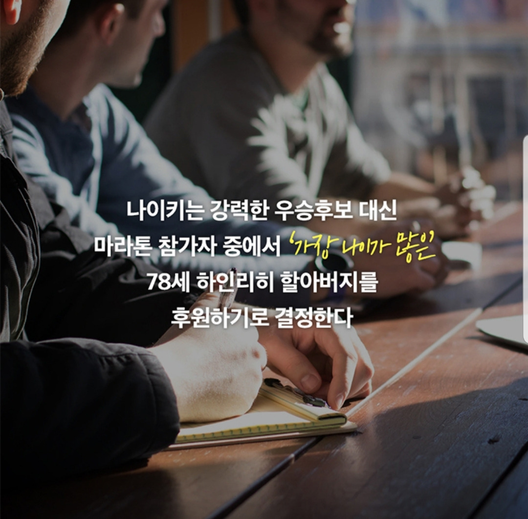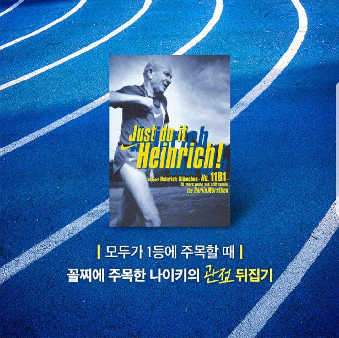 마라톤 공식 스폰서인 아디다스가 유력 주자들을 후원할 때 나이키는 가장 나이든 하인리히를 후원했다고 하네요. 78세 하인리히 할아버지가 나이키 운동화를 신고 끝끝내 포기하지 않은 채 꼴찌로 결승점에 들어선 순간. 관중은 열광합니다.