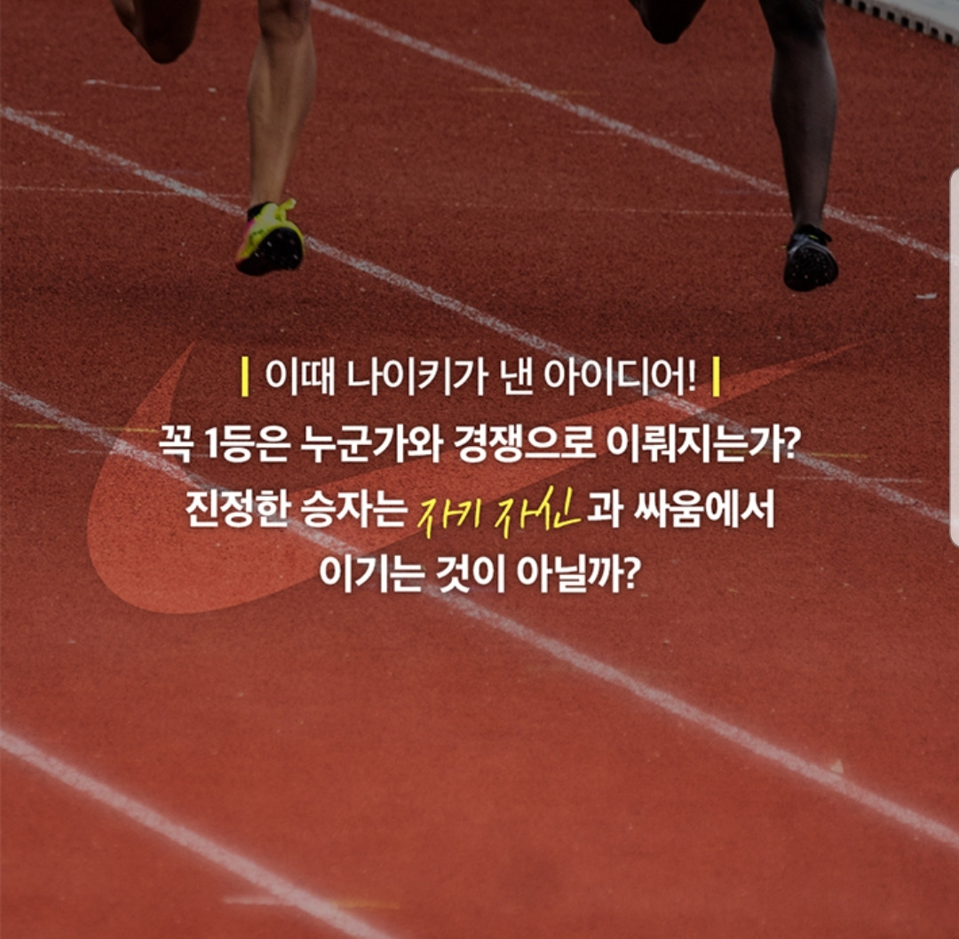 나이키의 매출은 수직 상승하고요. 나이키의 이러한 관점 뒤집기가 결국은 회사 매출을 위한 것이었겠지만요. 그럼에도 불구하고 마라톤을 인생에 비유하여 꼴찌에게도 박수를 보낼 준비를 하는 세상과 세상 사람들에 관한 이야기는 감동적입니다.