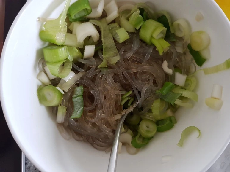 깍둑썰기 한 굵은 파에 당면 삶은 걸