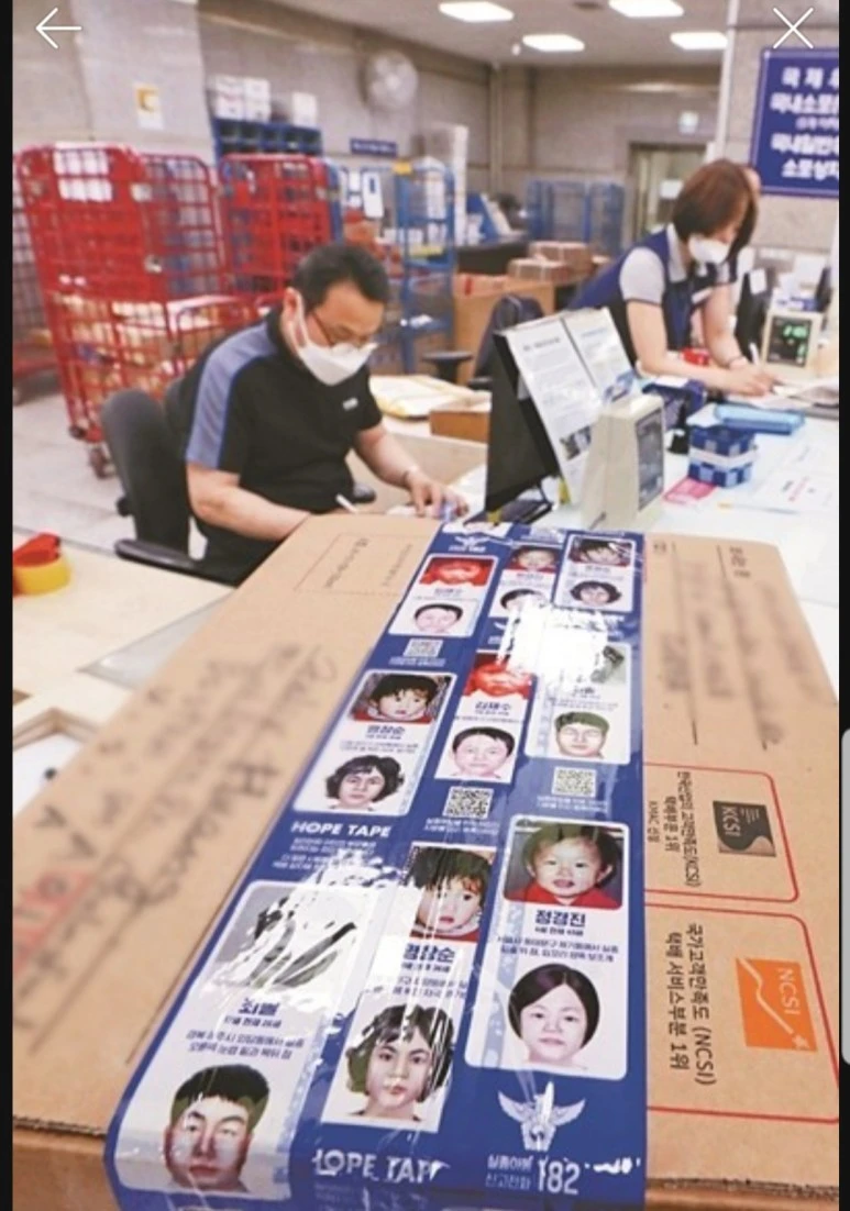 일명 '호프테이프(hope tape)'이다. 28명의 장기 실종 아동의 당시 모습과 세월의 흐름에 따른 나이 변환 몽타주 기법으로 현재의 모습을 박스 테이프에 인쇄하였다고 한다