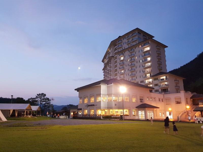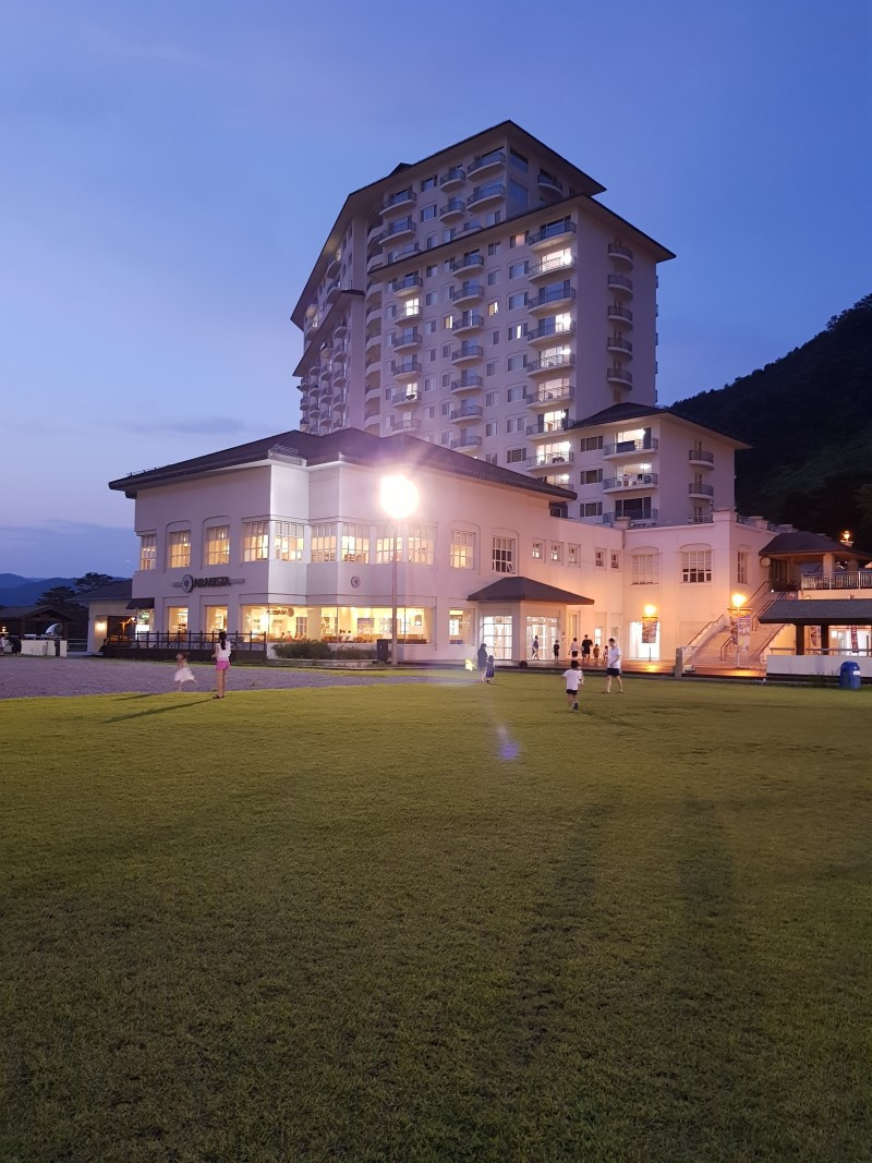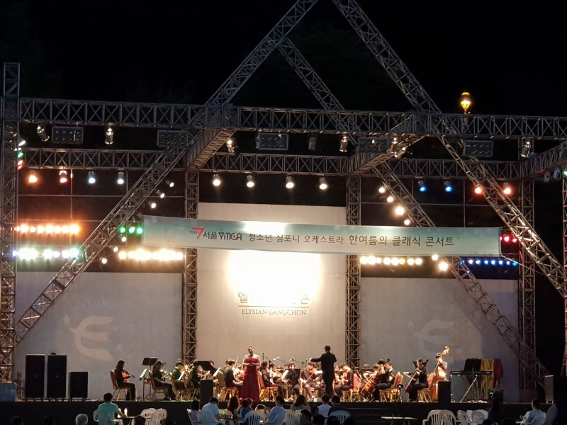 그때 잔디밭 한쪽에 설치된 야외 공연 무대로 청소년 오케스트라 단이 올라왔습니다. 한여름밤의 클래식 콘서트가 펼쳐지는 사이 투숙객들은 시원한 맥주를 마시며 감상을 할 수 있었어요. 초등학생과 중, 고등학생이 섞여 있는 듯한 오케스트라단이었어요. 모두가 검정 옷을 입고 악기를 연주하더군요.