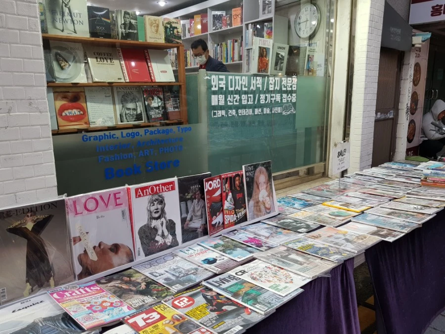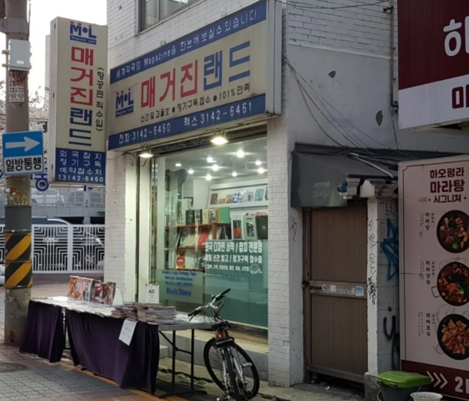 아늑해 보이는 식당 조명 건너편으로는 시대를 거슬러 살아가는 잡지들이 가판대를 장식하고 있다. 잡지 전문 서점인지 이름도 매거진 랜드이다. 외국 잡지를 정기 구독할 수 있는 곳.