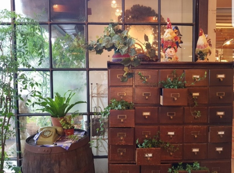 여름휴가 중 비가 오던 날이 있었습니다. 비를 피해 들어간 카페의 전경이 고즈넉하니 좋았어요. 카페 입구는 여러 가지 물건들로 꾸며져 있었는데 눈길을 사로잡는 서랍장이 보이더군요. 그것을 보자마자 저의 과거가 소환되었습니다.