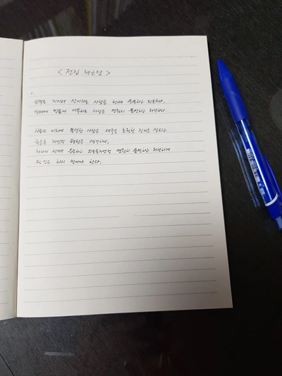 손바닥만 한 노트에 한 단락 적고 빈칸을 남겨 놓았어요. 돈이 많아서 종이 낭비하는 건 아니고요. 언젠가 제 딸아이의 마음에 살랑살랑 훈풍이 불어와서 '본인도 필사를 해 보겠다'라는 기특하면서도 제정신 아닌? 멘트를 꺼낼 날이 올지도 모르잖아요. 그래서 그냥 한번 빈칸을 내버려 둬 봤어요. 따라 쓰면 모녀 공동의 <채근담> 필사 노트가 되는 것이고요. 아니면 뭐 저 혼자 쓰는 필사 노트인 거고요.