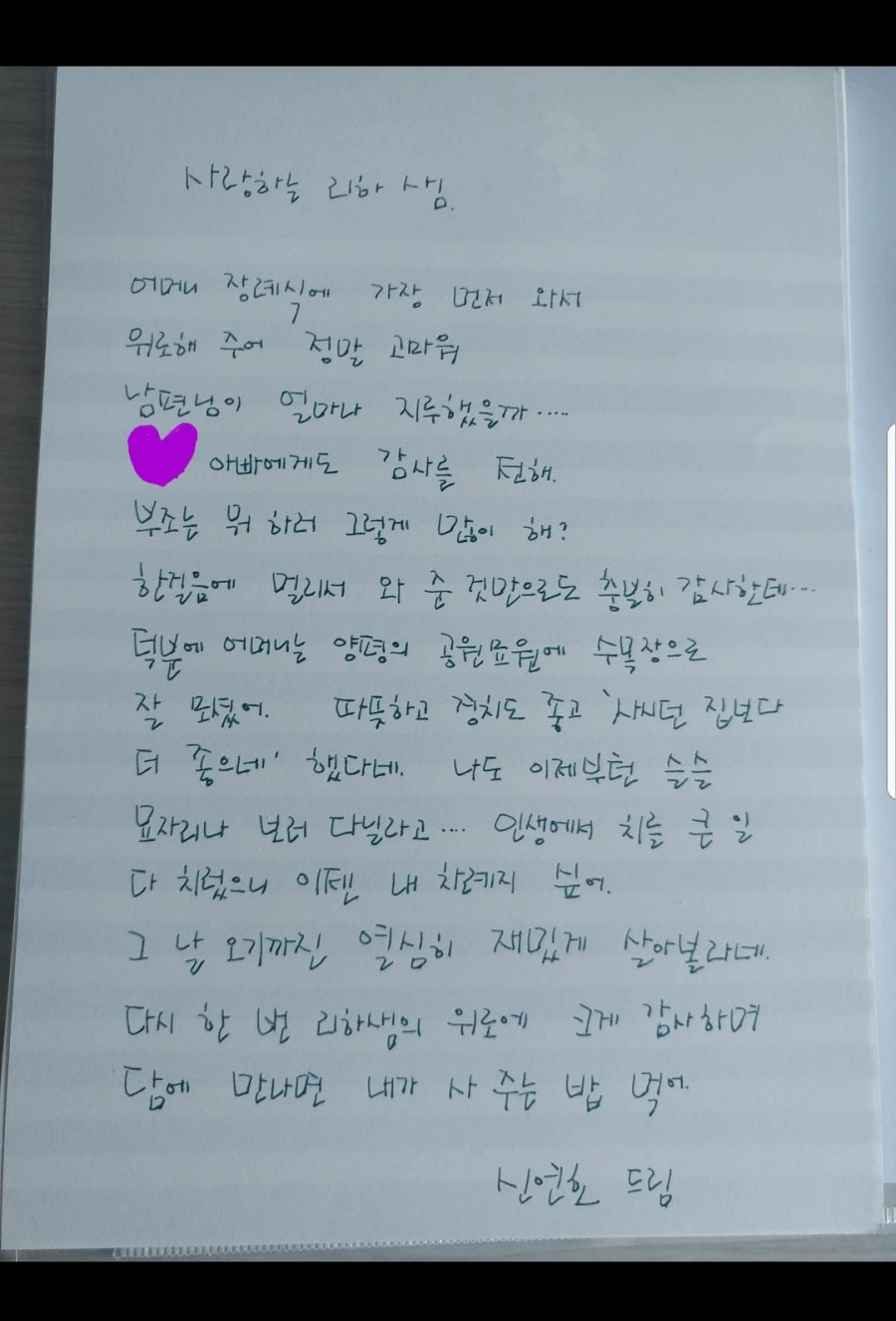 저는 이런 카톡을 처음 받아봤는데요. 자신이 손편지를 써서 사진으로 찍어 보낸 거예요. 휴대폰 자판으로 친 문자가 아닌 손글씨를 보면서 많은 생각을 하게 되더라고요.