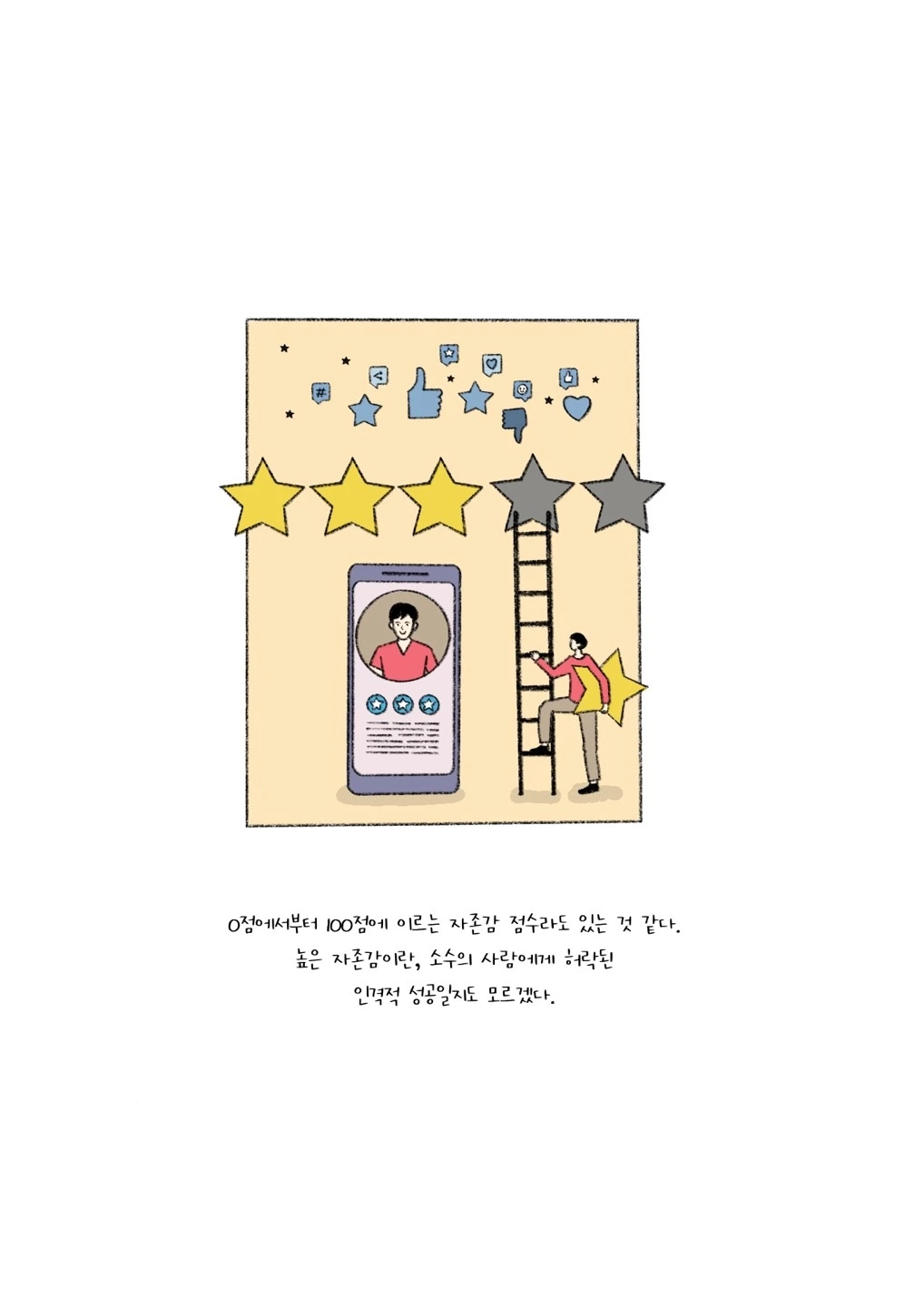 그러나 무엇이 그 ‘타인들’을 그렇게 특별하게 만드는지 매우 의문스럽다. 전지전능한 신도, 처분을 내릴 재판관도, 시비를 가릴 감독도 아니지 않은가. 그들 역시 우리와 같이 불완전한 존재이자 인간일 뿐일텐데 말이다. 애초에 내가 아닌 다른 사람들이 나의 자존감 점수를 매길 수는 없는 일이다.