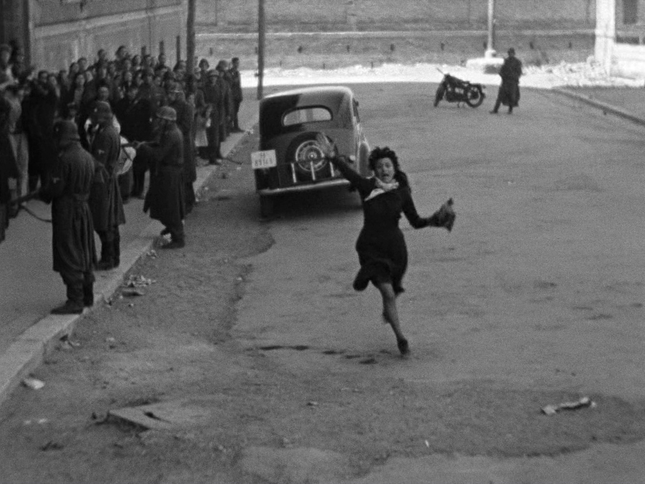 둘째는 피나가 독일군에게 체포되어 끌려가는 프란체스코를 쫓아가며 거리를 달리다가 총에 맞아 쓰러지는 장면이다. 이 장면은 핸드헬드 카메라로 촬영되어 상황의 긴박감과 인물의 절망을 강렬히 전달한다. 피나가 총에 맞아 쓰러지는 장면은 one-shot 기법으로 하나의 연속된 숏으로 처리된다. 이 장면은 그녀의 죽음이 극적으로 표현되지 않고 마치 현실 세계의 한 모습처럼 흐름처럼 목격된다. 전쟁 속에서 죽음이란 허망하고 갑작스러우며 언제 찾아올지 모르는 것임을 관객은 느끼게 된다.