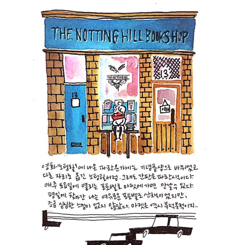 포토벨로 로드에 위치한 '노팅힐 서점'. 영화 노팅힐에 나온 이후로 관광객들의 발걸음이 끊이지 않는 것 같다. 나도 저번 런던 여행에서도 찾아왔던 서점인데, 왜인지는 모르겠지만 다시 찾아오게 되었다. 노팅힐 영화에서 볼 수 있는 파란색 문은 기념품샵으로 자리를 내주었고 서점 다른 건물로 옮겼다. 문이 파란색은 아니지만 파란 간판으로 쉽게 발견할 수 있었다. 가게 앞에 놓여있는 의자에서는 주인공이 되기 위한 사진 촬영이 이어졌다. '나도 하나 부탁해야 하나..' 싶었지만, 파란 간판을 내 스케치북에 옮겨 담는 일로 만족하고 돌아왔다.