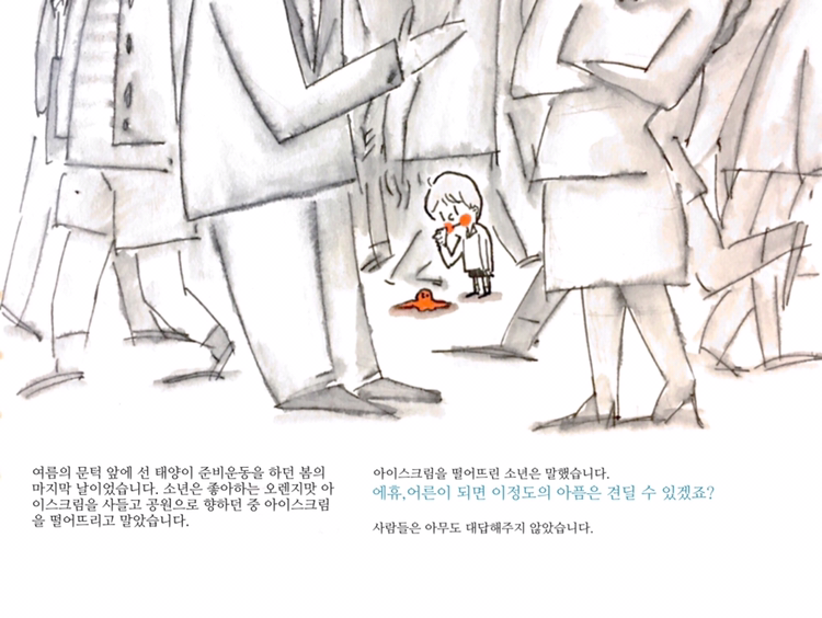 여름의 문턱 앞에 선 태양이 준비운동을 하던봄의 마지막 날이었습니다. 소년은 좋아하는 오렌지맛 아이스크림을 사들고 공원으로 향하던 중 아이스크림을 떨어뜨리고 말았습니다.아이스크림을 떨어뜨린 소년은 말했습니다.에휴,어른이 되면 이정도의 아픔은 견딜 수 있겠죠?