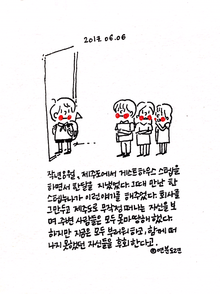 작년 8월, 제주도에서 게스트하우스 스텝을 하면서 한 달을 지냈었다. 그때 만났던 한 스텝 누나가 들려준 이야기가 있다. 회사에 퇴사를 하고 제주도로 내려가는 자신을 보면서 주변 사람들은 못마땅해 했었다고 한다. 하지만 지금은 다들 부러워하는 말을 전한다고 했다. 우리는 가보지 않은 길을 가는 사람에게 시기와 질투로 혀를 찬다. 그리고 시간이 지나 여전히 그 길을 걷고 있는 사람에게 함께 떠나지 않았던 자신을 후회하며 자책하곤 한다. 하지만 후회하는 그 순간에도 새로운 길을 찾아가는 사람에게 시기와 질투로 혀를 차고 있다.
