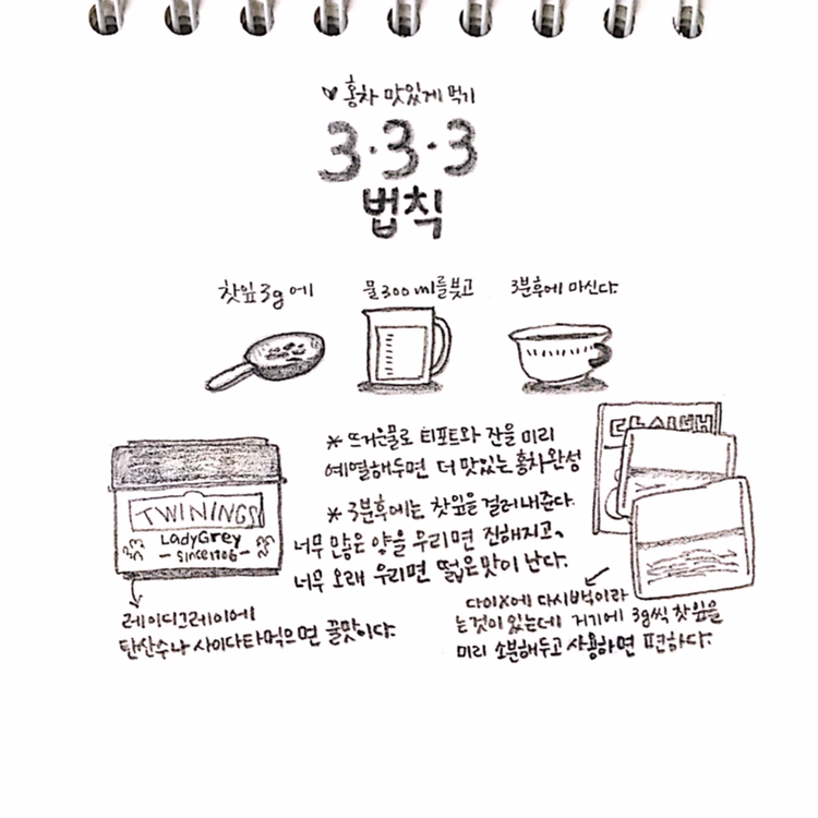 그중에서 초보자들이 쉽게 따라할 수 있는 333법칙이 생각난다. 찻잎 3g에 물 300ml를 넣고 3분동안 우려서 먹으면 맛있는 홍차를 마실 수 있다고 한다. 3분 후에는 찻잎을 걸러내야 한다. 처음 홍차를 마실 때는 찻잎을 좀 더 많이 넣으면 향이 가득한 차를 마실 수 있을 줄 알았고, 걸러내야 하는 찻잎이 아깝다는 기분에 여러번 우려 먹었었다. 하지만 그건 그냥 욕심일 뿐이었다. 너무 많이 우리면 차가 진해지고, 너무 오래 우리면 차 맛이 떫어진다.
