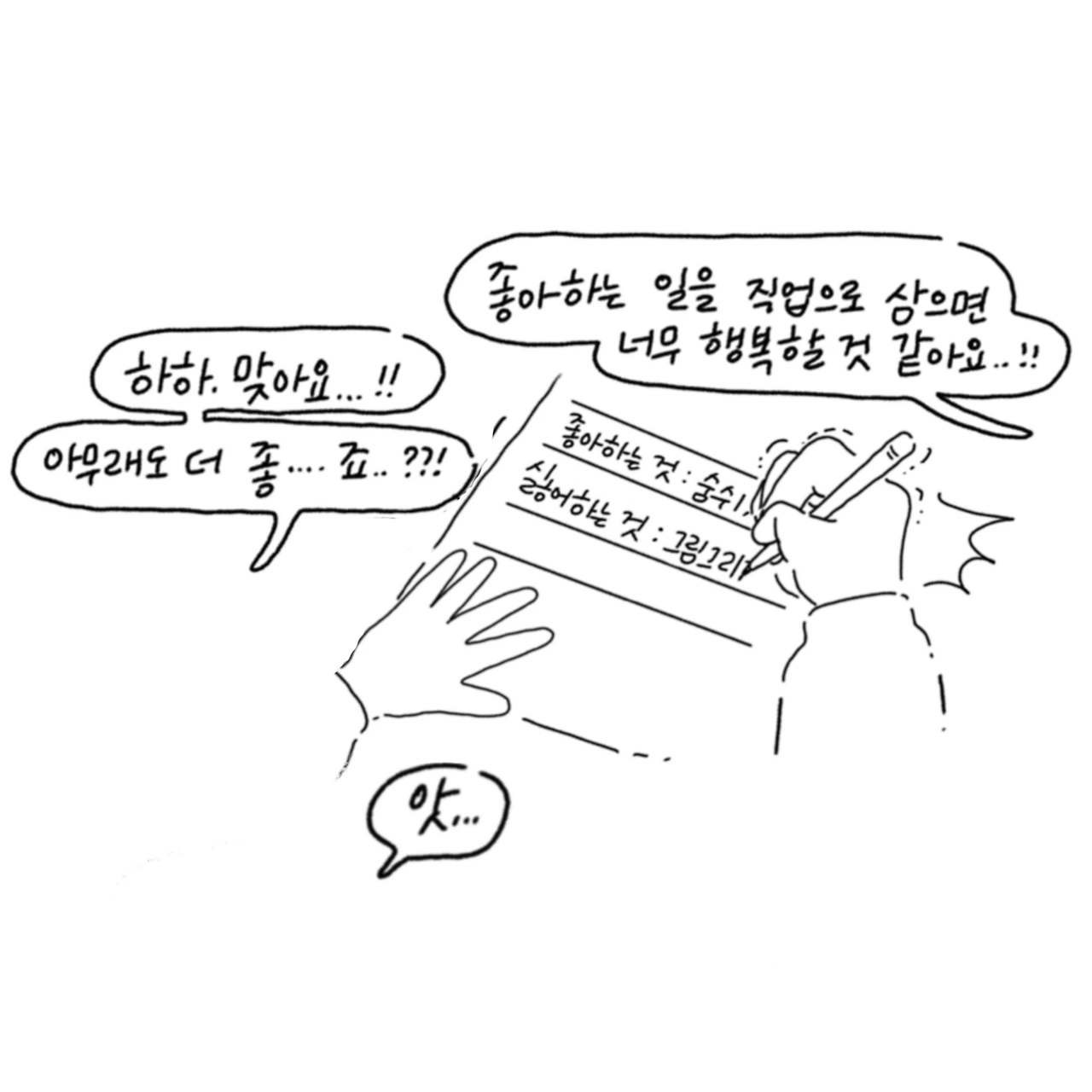 아마 대부분의 사람들이 하는 생각일지 모르지만, 스스로를 믿고 의지하며 선택한 길이었기 때문에 이런 질문 앞에서 나는 어떤 고민보다 심각했었다. 나도 모르게 싫어하는 일에 ‘그림 그리는 일’이라는 글을 써넣을 정도로.