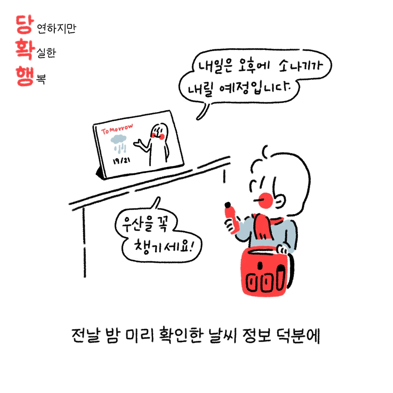 그래서 이제는 잠들기 전 날씨정보를 체크하는 습관을 갖게 되었죠. 작은 습관으로 인해 오늘은 안전했습니다. 오늘의 당확행이네요 :)