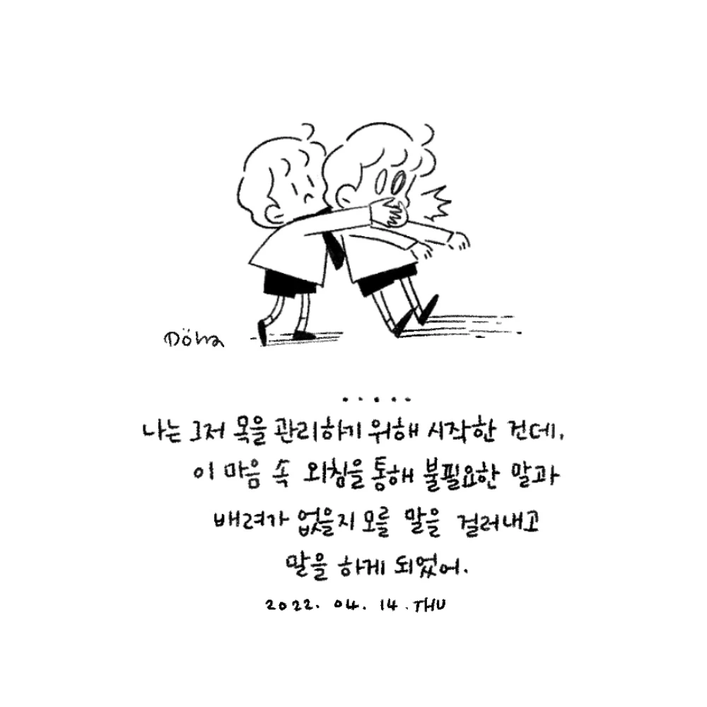 그리고 회사에서 의견을 나누거나 가벼운 대화를 할 때, 천천히!를 마음속으로 외쳐봤어. 신기하게도 이 외침을 통해 흥미로운 점을 찾게 되었지. 나는 그저 목을 관리하기 위해 시작한 건데, 이 마음속 외침을 통해 불필요한 말과 배려가 없을지 모를 말을 걸러내고 말을 하게 되었어. (물론 아직은 조금 미숙하지만.)