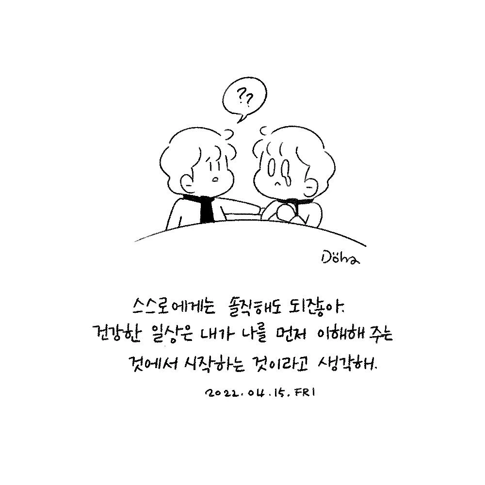 스스로에게는 솔직해도 되잖아. 건강한 일상은 내가 나를 먼저 위로해 주고 이해해 주는 것에서 시작하는 것이라고 생각해. 스스로에게 솔직한 사람이 되어 건강하고 오랫동안 하고 싶은 일과 도전을 이어가는 사람이 되자.