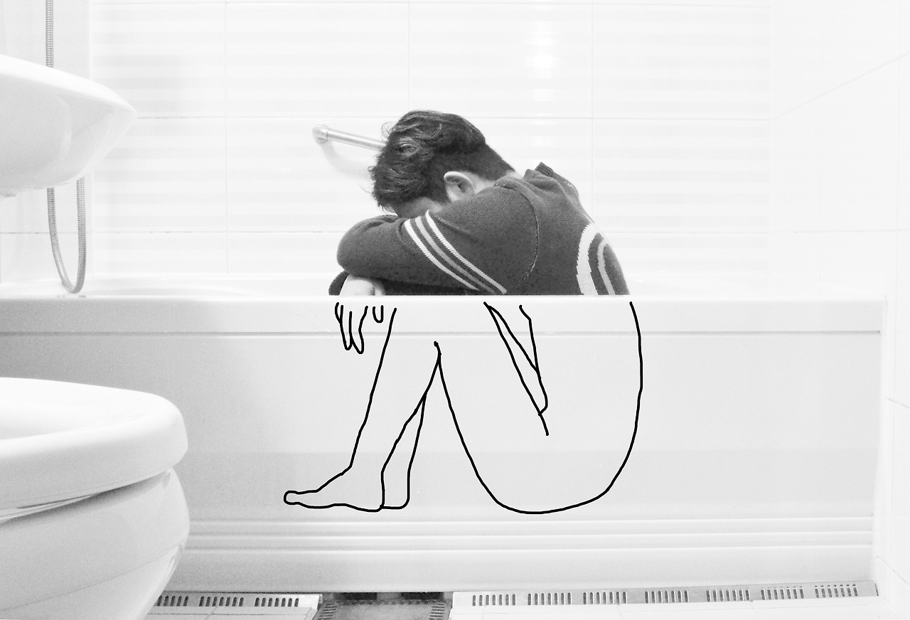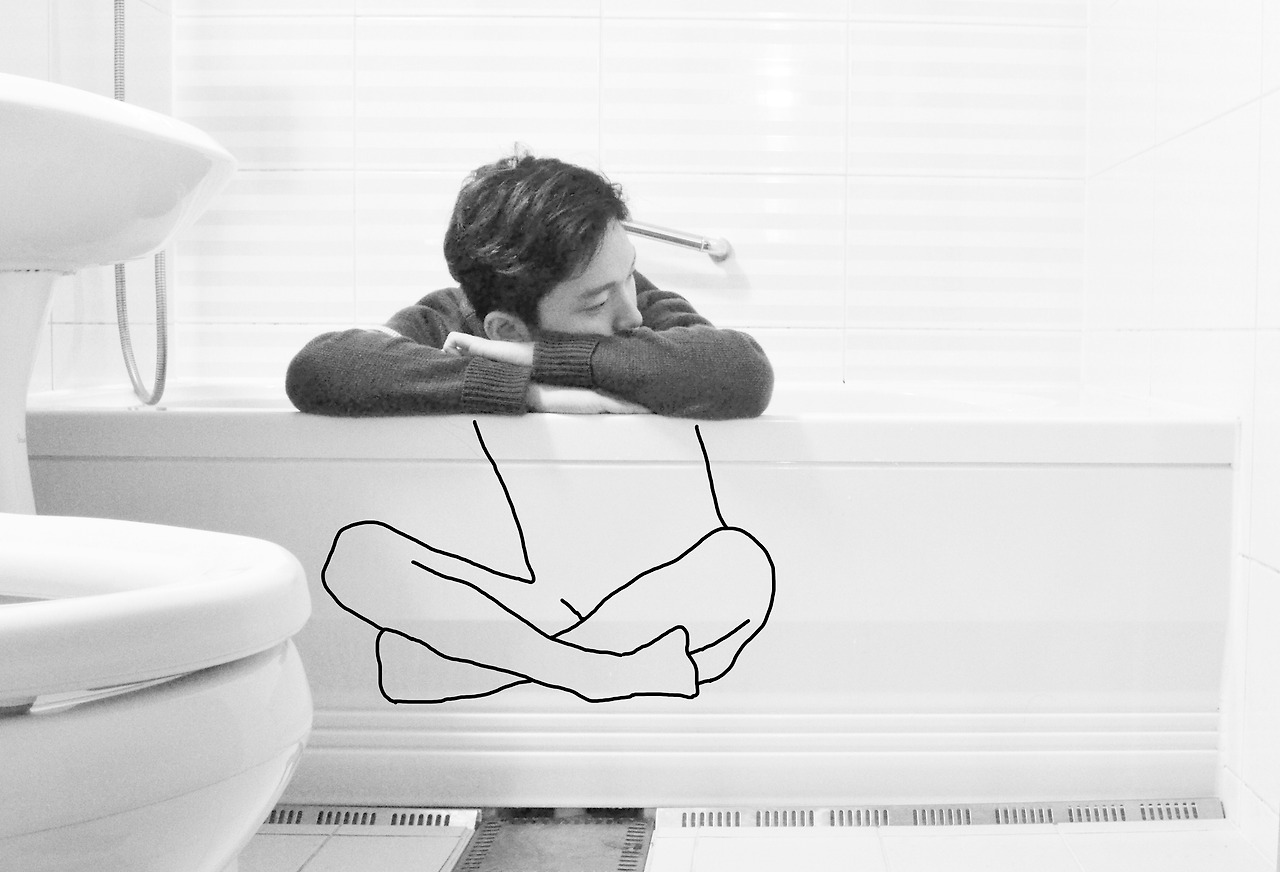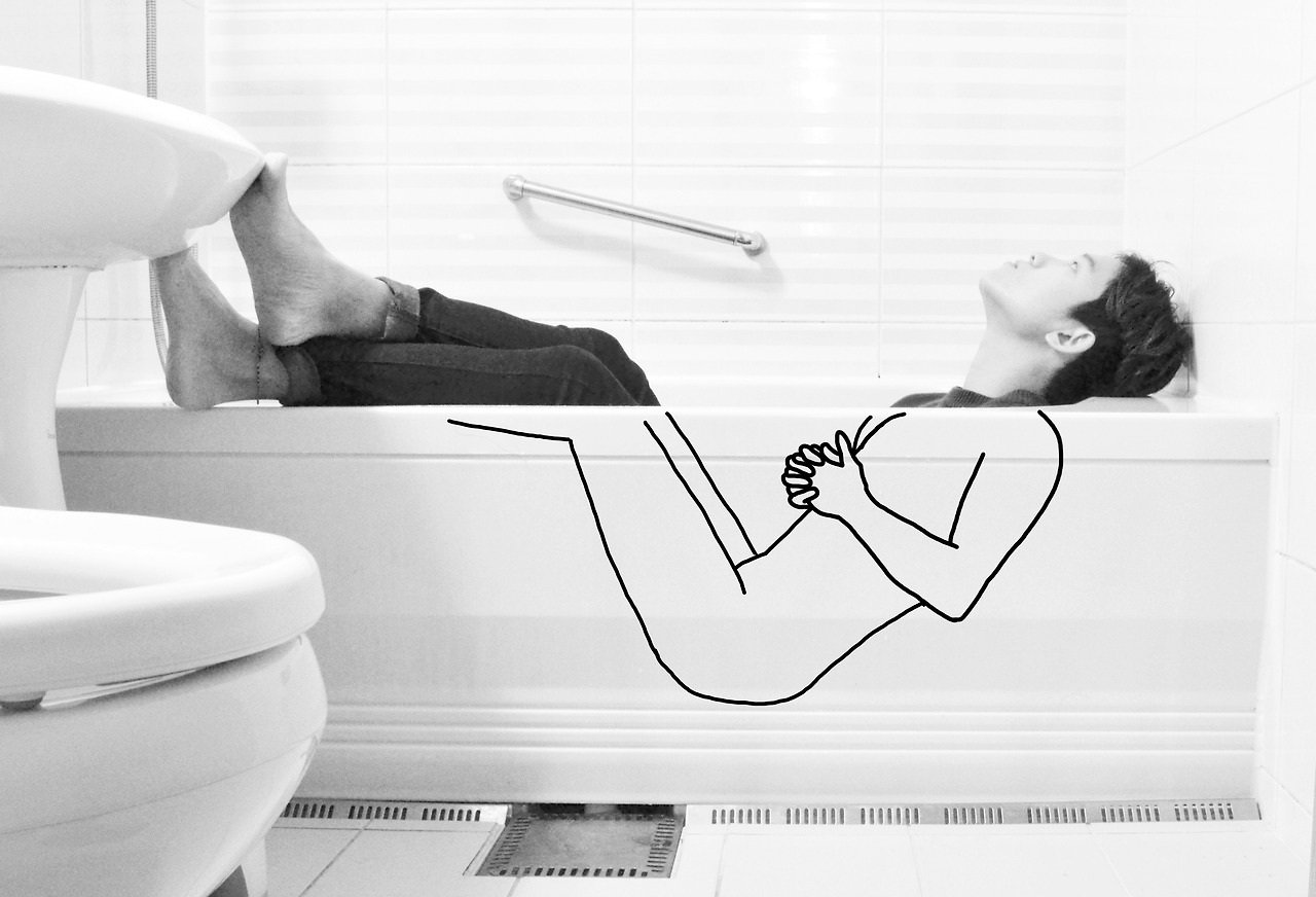 사진에서 욕조 안은 드로잉으로 되어있고 밖은 실제 나의 모습으로 되어있다. 욕조 안과 밖은 목욕하는 시간과 아닌 시간으로 나눠지는 것이다. 목욕하는 시간 나는 누구보다 가볍고 편안하고 여유롭다. 마치 선으로만 이뤄져 있는 드로잉처럼 무게를 재볼 필요를 못 느낄 만큼. 하지만 목욕하는 시간을 벗어난 나는 고민과 걱정 투성이다. 우울하고 어둡기도 하다. 그리고 계속해서 욕조를 갈망한다. 그러한 두 가지 삶의 모습을 욕실에 담아보고 싶었다. 그리고 그렇게 했다.