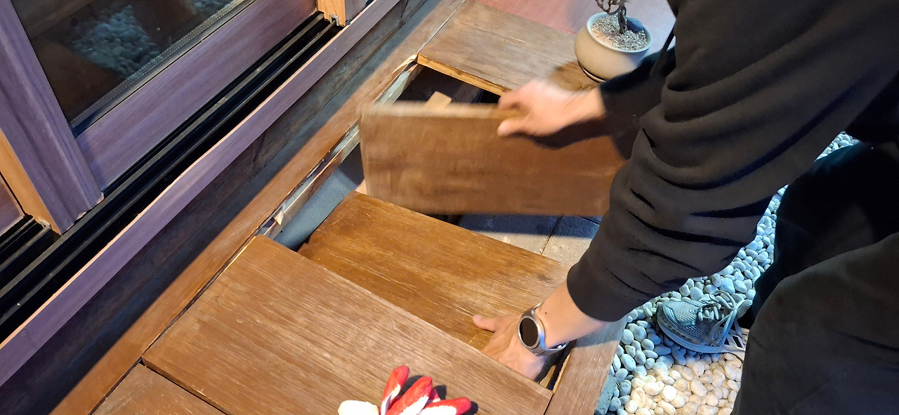 상황을 살펴보니 시간이 흘러 노후화된 툇마루 사이가 벌어지면서 이음새 부분이 무너진 것이다. (한옥 참 관리할 부분이 많구나..)