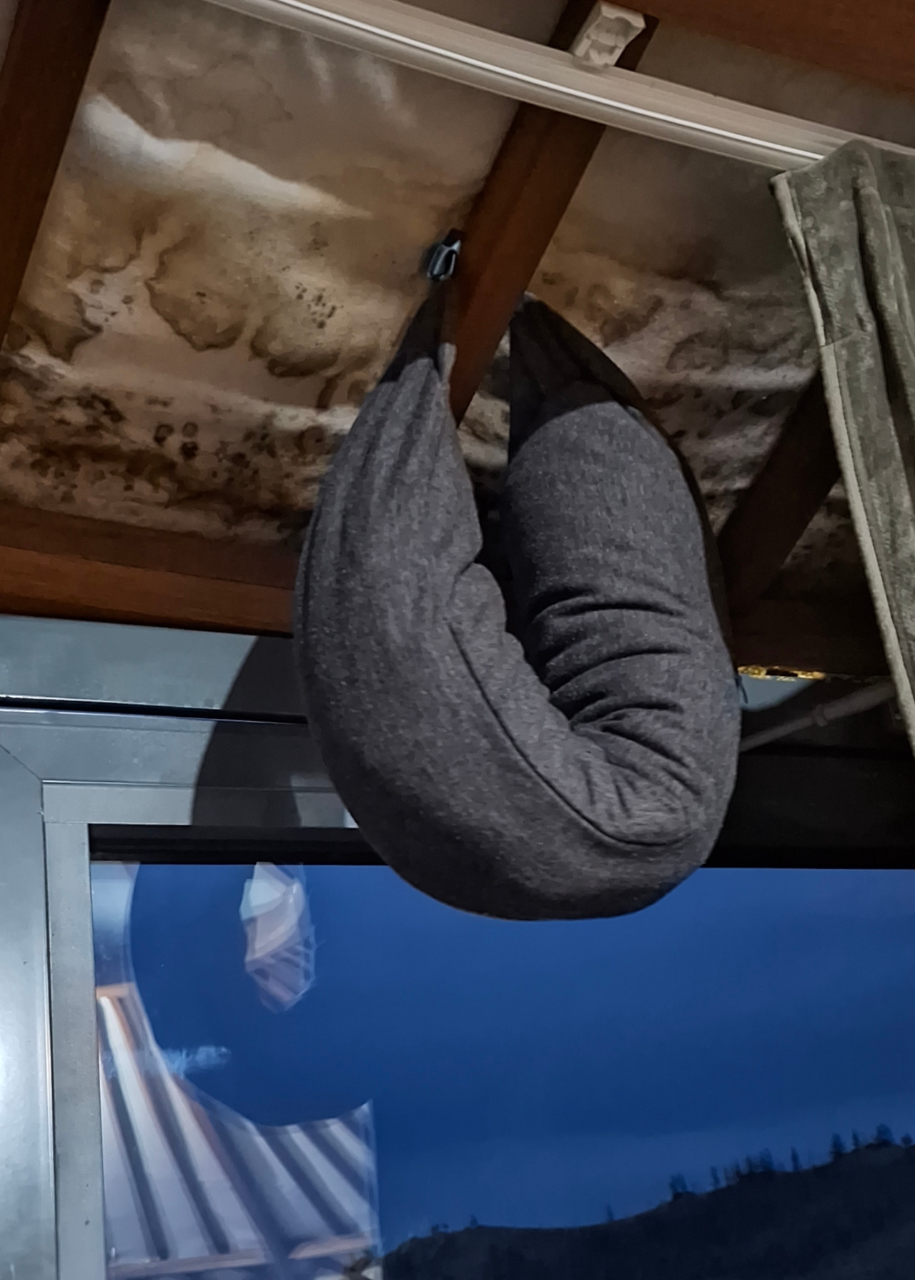 이대론 안 되겠다 싶어 차 안에서 이동할 때 쓰던 목베개를 문쪽에 걸어두어 부상을 방지했다.