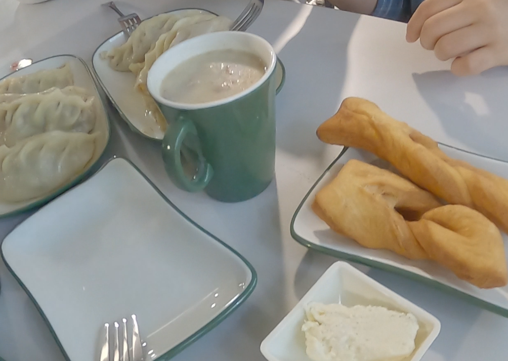 우리는 가이드님이 추천해 준 보쯔(찐만두)와 삐어러적(간 안 된 밀가루 튀김?), 수테차(양으로 고아낸 차..라고 해야 하나?)를 먹었다.