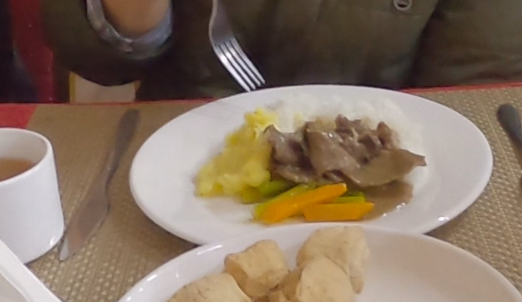 귀하디 귀한 채소 샐러드가 조금 나오고 메인메뉴는 소 불고기 비슷한 것에 으깬 감자 조금, 그리고 밥. 홍차나 수테차를 곁들이면 끝이다.