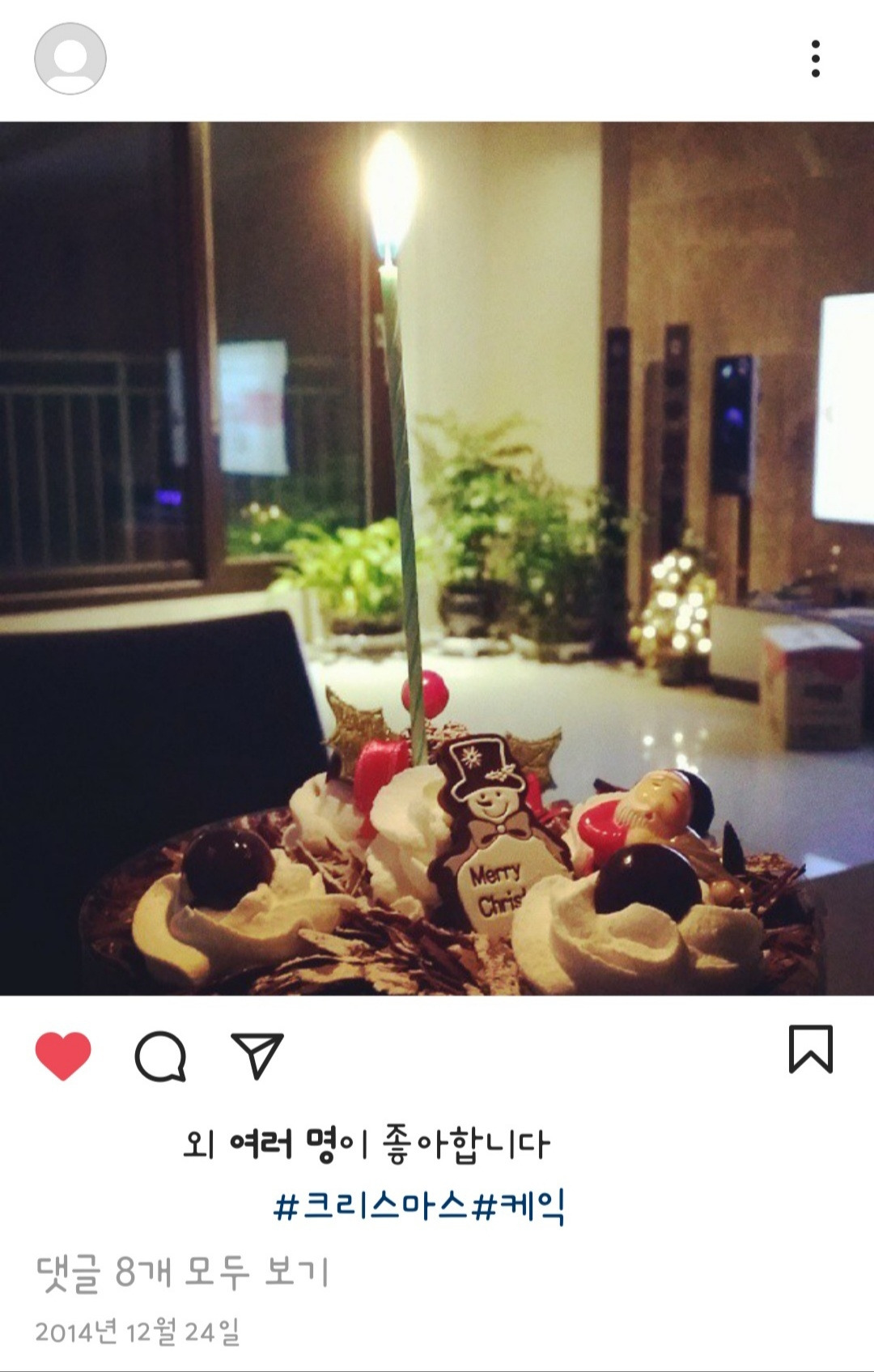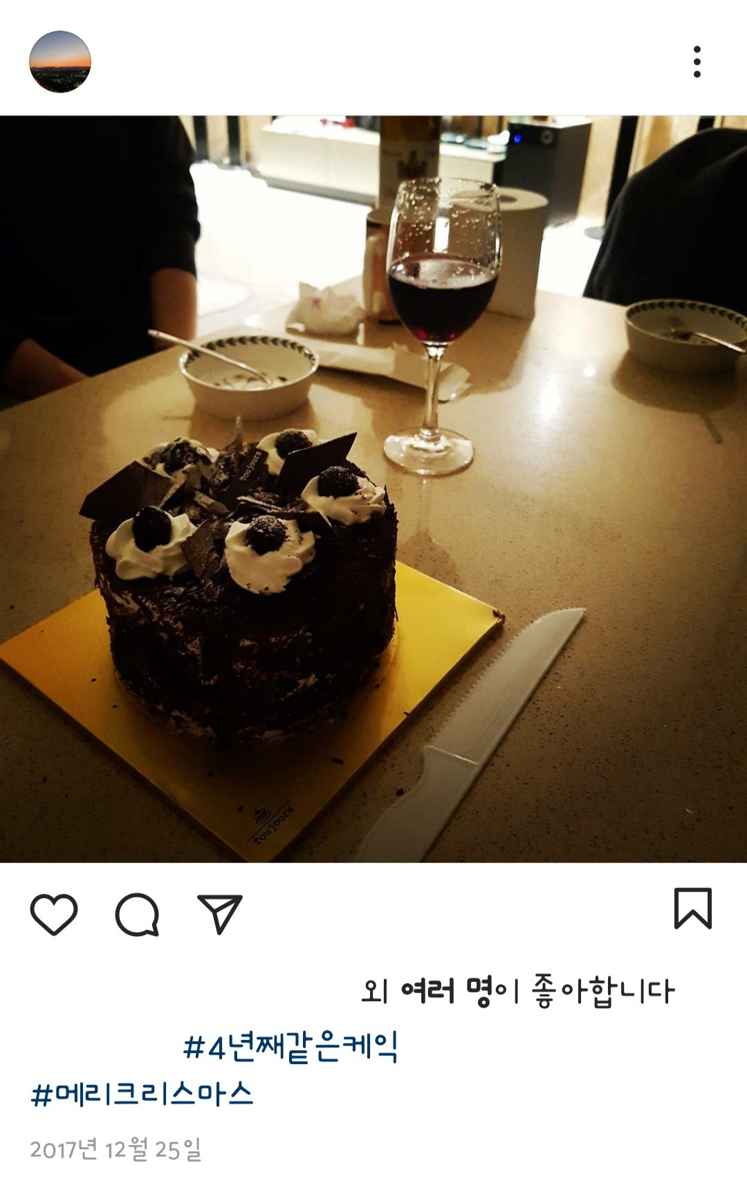 그전에도 그 후에도 우리 가족들은 크리스마스면 성당에 갔다. 어렸을 때 거의 성당에 끌려다녔는데, 미사를 본 후에 달콤한 케이크를 꼭 사주셨기 때문에 견딜 수 있었다. 우리 집은 크리스마스이브 때엔 항상 케이크를 사서 생일 축하 노래를 함께 부르고 초를 끄는 의식을 하는 그 시간이 참 좋다. 성당 미사 참석은 안 해도 온 가족이 모여하는 크리스마스 케이크 커팅식은 한 번도 빼먹은 적이 없다. 한 해를 마무리하며 다음 새해를 잘 보내게 해달라고 기도할 수 있는 시간이다. 가족 모두가 서로에게 덕담을 해주는 시간이기도 하다. 어떤 때는 아빠가 케이크를 사오시고 어떤 때는 동생이 사온다. 어느 날 우연히 동생 SNS에 업로드된, 크리스마스마다 찍었던 케이크 사진을 보고 깜짝 놀랐다. 모두 같은 제과점의 같은 모양 케이크였기 때문이다. 올해까지 같은 케이크를 사면 6년째! 역시, 밥을 매일 같이 먹은 식구라서 입맛이 같나 보다. 슬라이스처럼 얇게 썰어 가득 뿌려 채워 놓은 초코 가루. 그 안에는 생초코로 코팅되어 윤기가 좌르르 하다. 빵은 겹겹이 쌓였고, 그 사이사이로 보이는 달콤하고 고소한 생크림과 상큼한 딸기잼이 맛을 더해준다. 케이크 위에 놓인 산타나 트리 모형의 예쁜 장식들은 크리스마스 분위기를 제대로 내준다. 그 제과점이 매해 같은 케이크를 만들어 온 것도 놀랍다. 앞으로도 쭉 같은 케이크를 만들어준다면 우리는 계속 그 케이크를 살 것 같은 느낌이다.