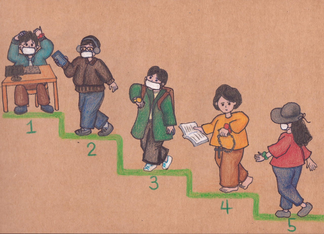 그 날 친정에 가서 관찰해보니 엄마는 집에서 스마트워치를 차고 걸으며 묵주를 들고 계셨다. 묵주기도가 끝난 다음에는 기도서를 들고 돌아다니셨다. 하루 종일 그렇게 남모르게 조용히 집안을 걷고 계셨다. 가족들이 꼴찌라고 놀리면 엄마는 장난으로 화가 난 모습의 이모티콘을 보내곤 했지만 장난이 아니었다. 이 대결에서 이기고 싶은 욕망이 가슴 한편에 불타오르고 있었다. 엄마가 하도 운동을 안 하고 집에만 있어서 운동하게 하려고 놀린 건데 효과가 베리 굳이었다.