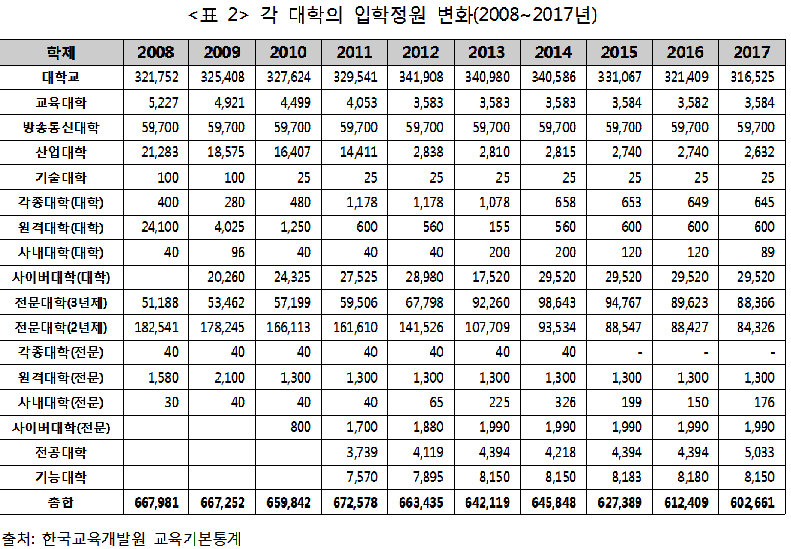 2017년 기준으로 고교 졸업자는 58만 명이지만 대학 정원은 60만 명이다.