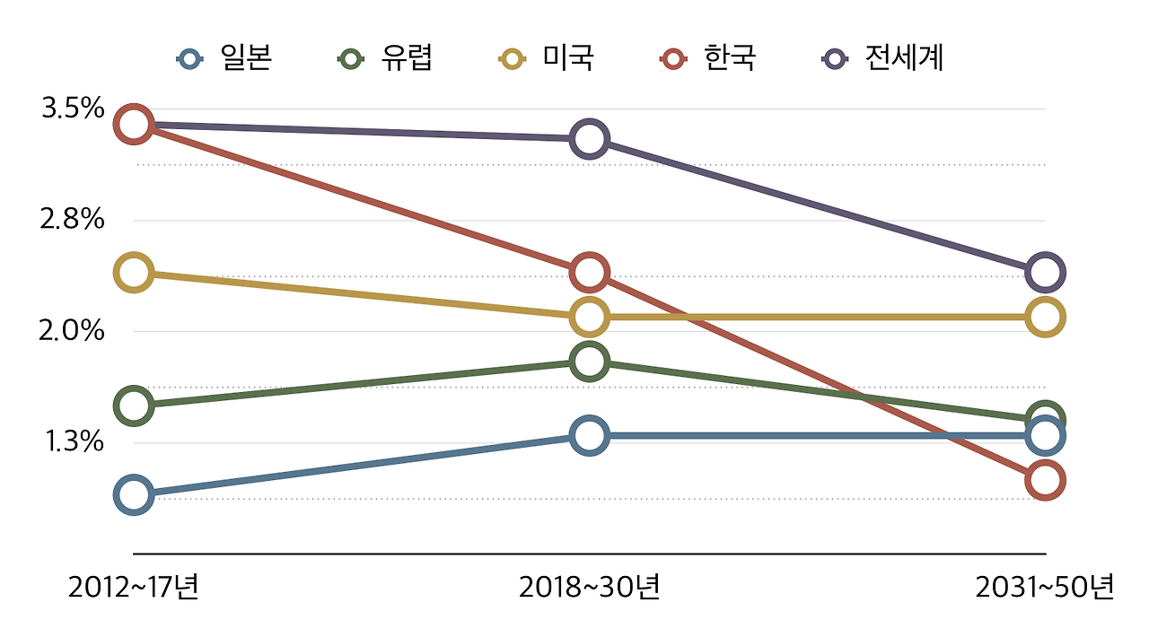 다른 한편, 과거 매년 5% 이상 성장하던 한국 경제는 2000년대를 거치면서 성장률이 4%대로 둔화하고, 2010년대에는 3%대로 하락했다. 더구나 향후 한국경제의 잠재 경제성장률은 2030년까지 2.4%, 2050년에는 1%로 하락할 것으로 OECD는 전망하고 있다.