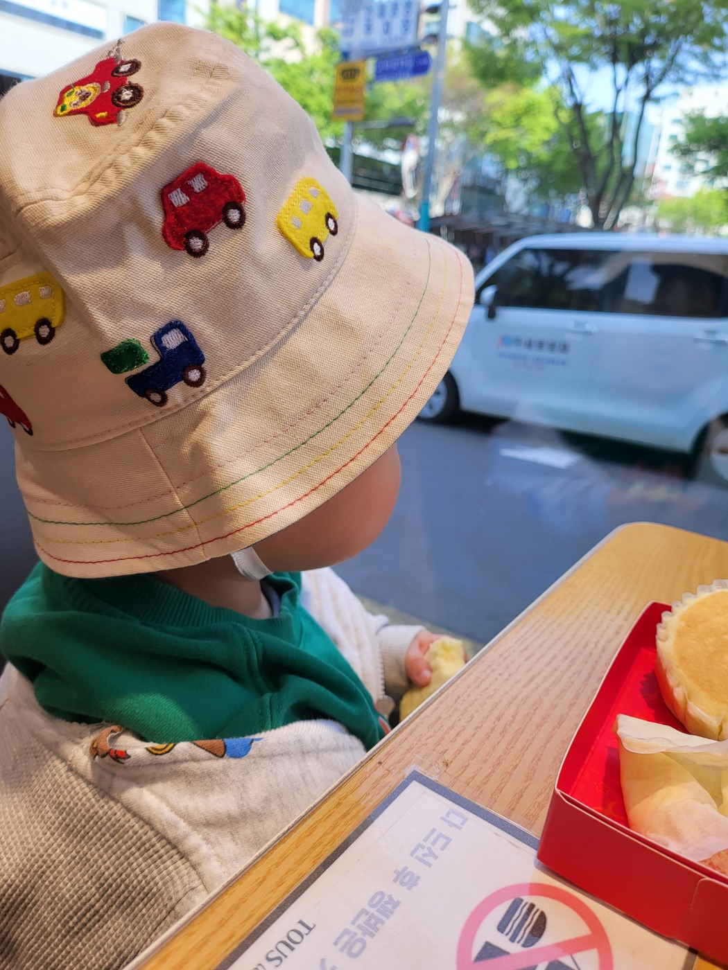인사를 배우는 녀석을 위해 빵을 받으며 고개까지 꾸벅 숙여준다. 먹던 빵은 이모에게 주고 새 빵 하나를 손에 잡은 채 만지작거리며 창밖을 내다본다. 지나가는 자동차를 바라보며, 여러 단어들을 내뱉지만. 미안하다. '빵빵'이랑 '부릉' 말고는 이모가 못 알아듣겠어. 아침식사를 든든히 했다는 녀석은 배가 부른 지 손으로 장난만 치다 결국 빵을 내려놓는다. 자아, 다시 이모 차 타자- 이모와의 아침나들이가 기분 좋은 듯, 조카의 입에서는 웃음소리가 터져 나온다.