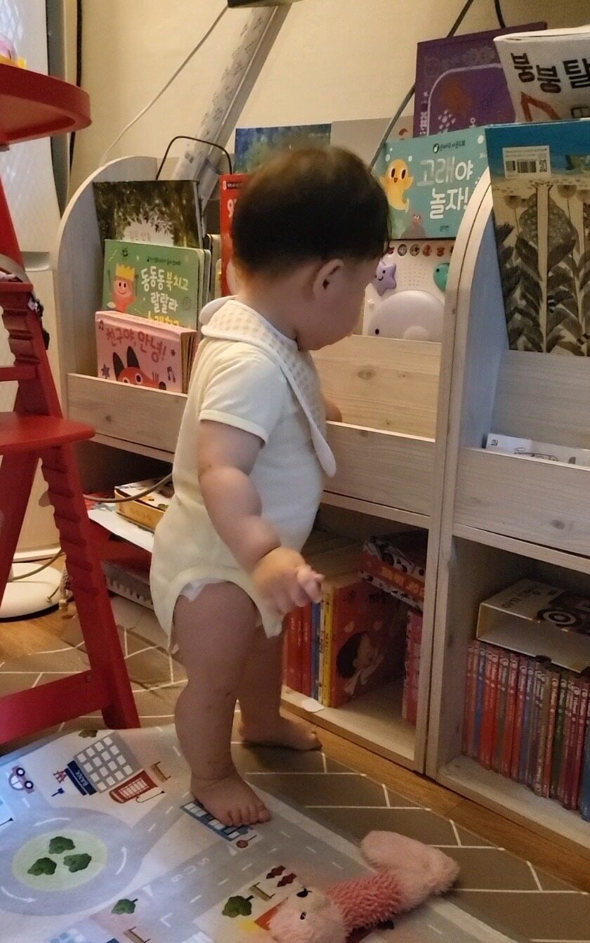 품에 안긴 채 손가락으로 가고 싶은 곳을 가리키더니 도착지는 책장 앞이다. 보고 싶은 책인지, 혹은 그냥 눈에 제일 먼저 들어온 것인지 책 한 권을 꺼내 건네주더니 무릎에 털썩 주저앉는다. 옛 어른들의 말로는 아기가 무릎에 안기듯이 앉는 행위들이 둘째를 암시하는 행동이라던데. 둘째 계획이 없는 친구네 아가도 비슷한 행동을 하는 것을 보면 사랑 듬뿍 받고 자라는 아가들의 공통점이 아닐까 싶어진다.