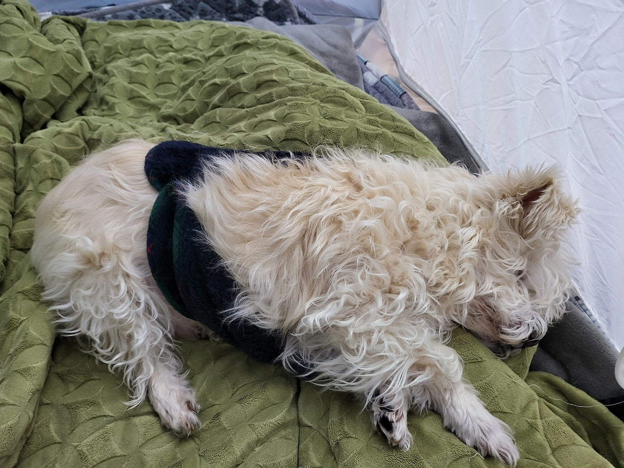 이불을 몇 차례 들춰봐도 강아지 옷이 보이질 않는다. 강아지에게 물어보아도. 그래, 답이 돌아올 리가 없지. 텐트 앞에 벗어두었던 얇은 겉옷 하나를 걸치며 밖을 나선다. 생각만큼 춥지는 않지만, 그렇다고 춥지 않은 날씨는 아닌 아침이다. 방문 문턱에 강아지 옷이 툭 떨어져 있다. 누나가 잠든 그 짧은 사이에 볼일까지 야무지게 보고 온 듯, 배변패드에는 아침의 흔적이 남아 있다.