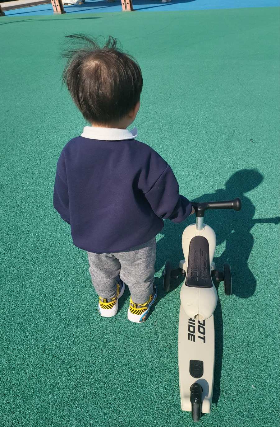 짧은 다리가 쉴 새 없이 땅바닥을 박차며 앞으로 나아간다. 동네 놀이터에서 누나나 형들의 모습을 빤히 바라보던 조카에게 사 준 엄마, 아빠의 크리스마스 선물이 제 빛을 발하는 날이다. 아직 어린 아가가 앉아서 타다가, 조금 더 크면 안장을 펼쳐 손잡이로 사용할 수 있는 킥보드다.