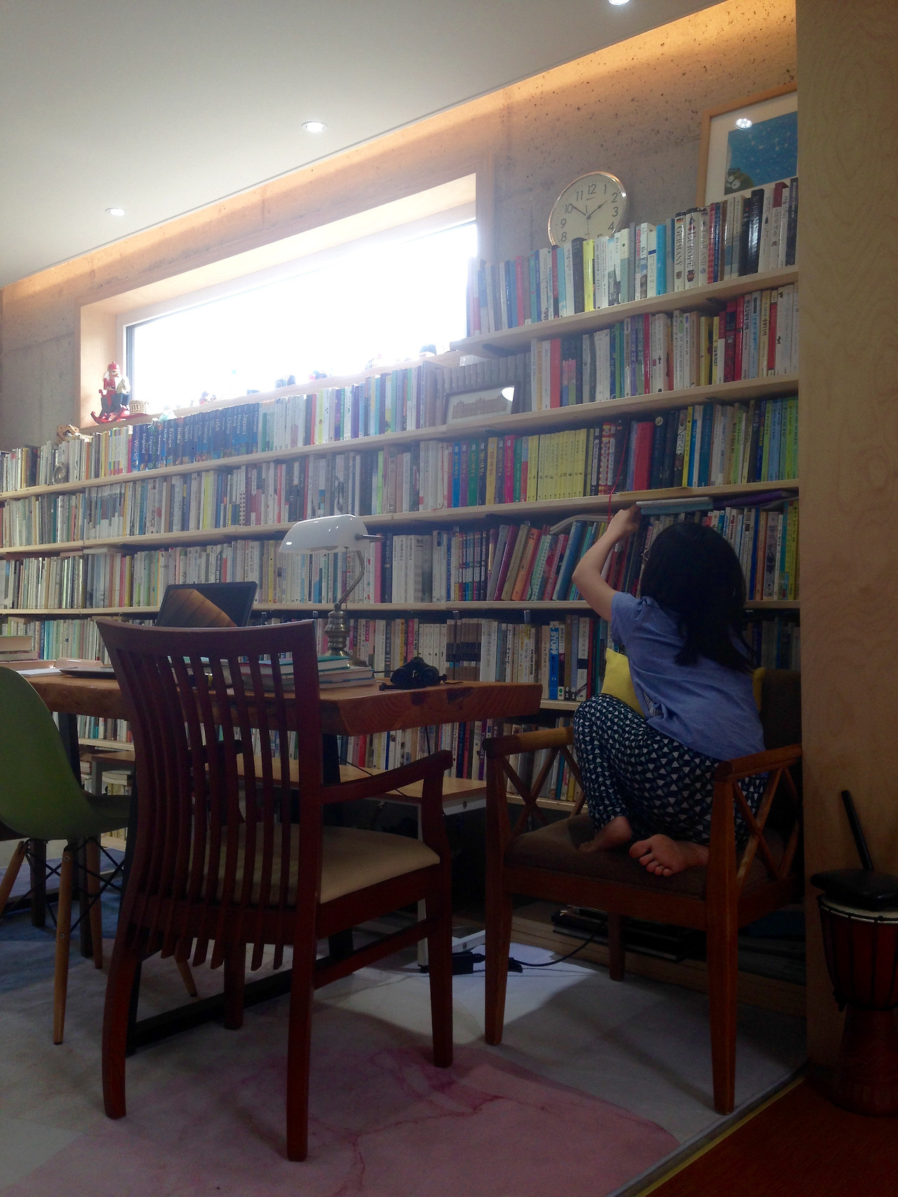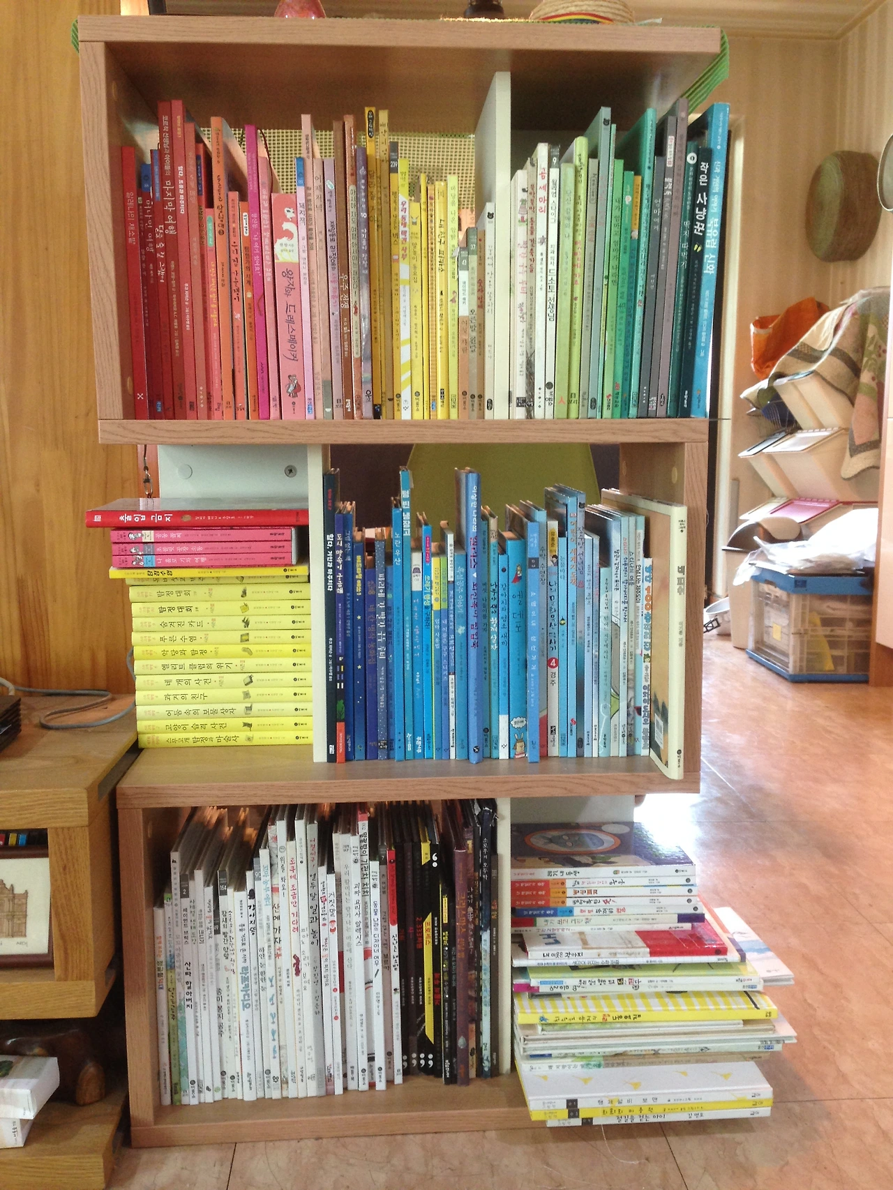 우리에게는 배경이 아닌 주연이나 다름없는 영화 속 그 집은 일본의 유명 건축가 아베 츠토무가 짓고 실제 살고 있는 집이라고 한다. 외벽부터가 내가 애정 하는 노출 콘크리트 형식에, 나비잠에 딱 어울리는 편안하고 따뜻한 공간은 충분히 매력적이었다. 하지만 예산에 쫓겨 많은 선택지가 없었던 우리에게 대부분이 그림의 떡이었다. 우리가 눈여겨보고 참고가 되었던 것은 찬해가 료코의 부탁으로 정리한 서재다. 유명작가인 료코는 연대별, 작가별 등으로 정리된 틀에 박힌 서재가 싫다. 눈을 감고도 이쯤이면 이 작가의 이 책이 있겠지. 하고 눈을 떠보면 항상 그 책인 게 싫었던 그녀는 좀 다른 방식으로 책을 정리하고 싶다. 료코의 부탁에 따라 찬해는 색깔과 음영에 따라 책을 정리한다. 그라데이션으로 춤추는 듯한 파란 책장은 너무나도 아름다웠다. 어떤 책을 찾아가는 게 아니라 우연히 어떤 책을 마주치게 되는 서재에 매료된 나는 우리 서재도 저렇게 정리하자고 남편을 졸랐다. 남편은 시큰둥했다. 우리나라 책, 특히 우리 책은 무채색이 많아서 저런 느낌이 나오지 않을 것 같다며. 그러더니 갑자기 딸의 그림책 책장으로 가서는 색깔별로 책을 정리했다. 짜잔, 바로 요런 느낌 되시겠다.