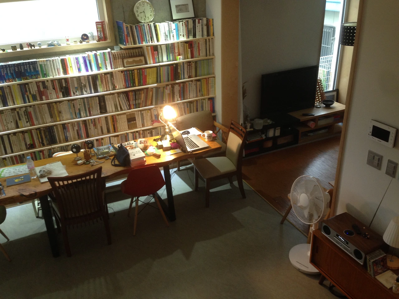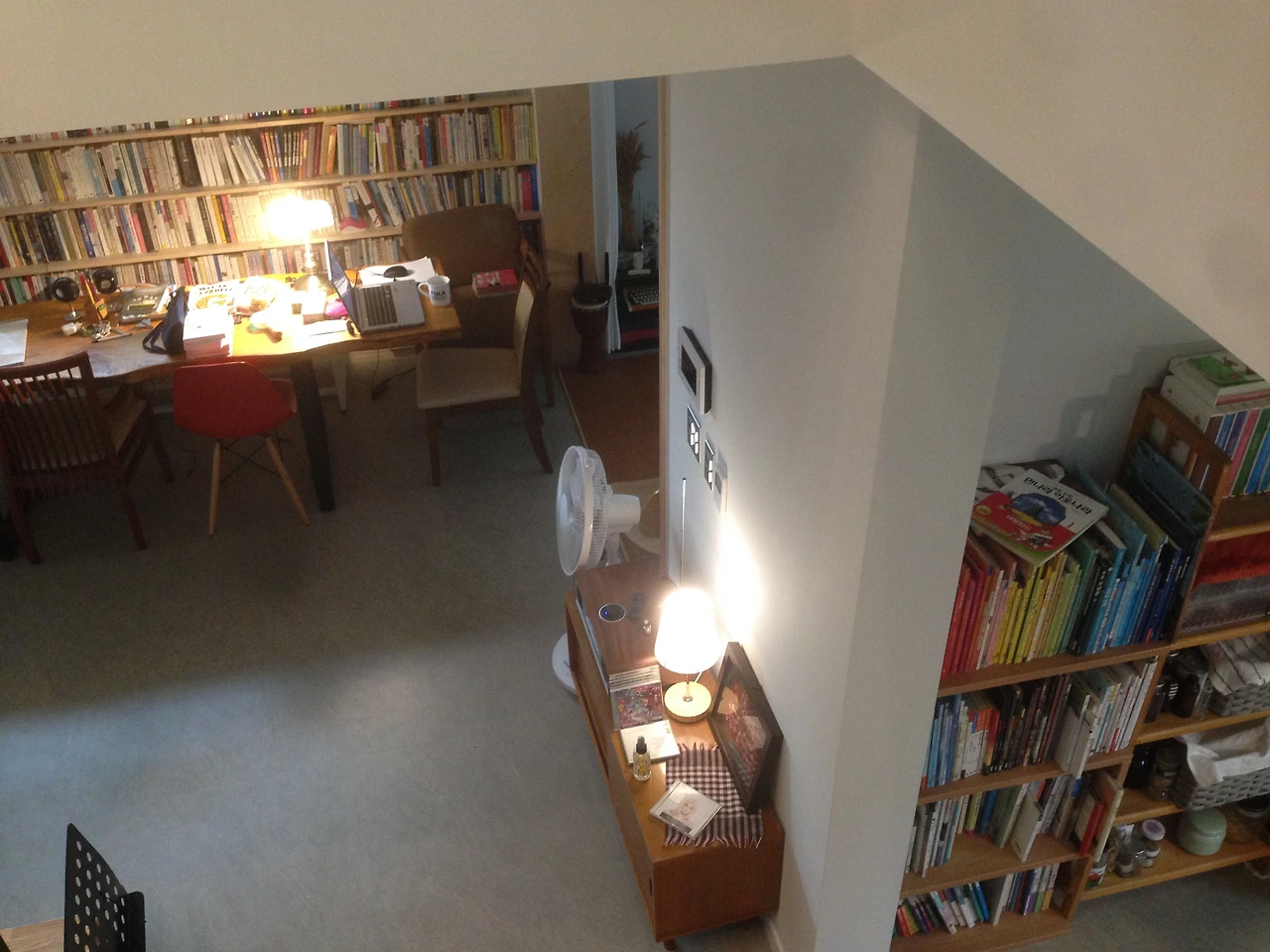 자, 여기까지는 좋았다. 결정적인 실수, 옥에 티가 있다. 바로 조명이다. 계단 보이드 천장에 실링팬을 설치하면서 계단에 유일한 조명은 벽에 붙은 간접등 밖에 없다. 어쩔 수 없이 스탠드를 사용해야 하는데, 계단 벽에 그 흔한 콘센트도 하나 빼놓지 않았다. 당시에 엉뚱한 곳에 정신을 빼앗기면서 에너지와 집중력을 잃었고 조명을 잘 챙기지 못했다. 하지만 어쩌랴. 아쉬운 대로 저 멀리 콘센트에서 멀티탭을 연결하여 피아노 위에도, 계단에도 스탠드를 놓고 사용하고 있다. 멀티탭과 전선 노출을 볼 때마다 눈에 거슬리지만 어쩌겠나. 집이란 완벽할 수 없다.