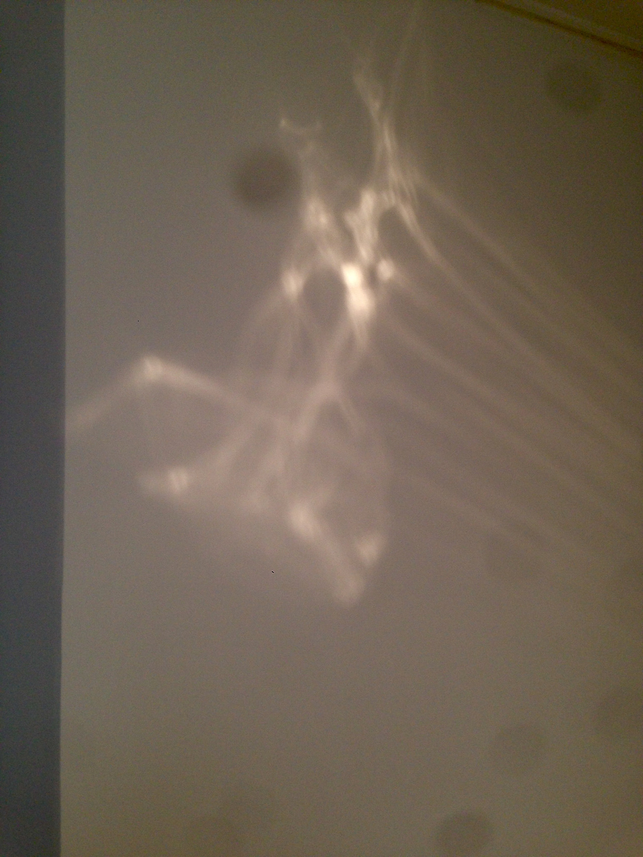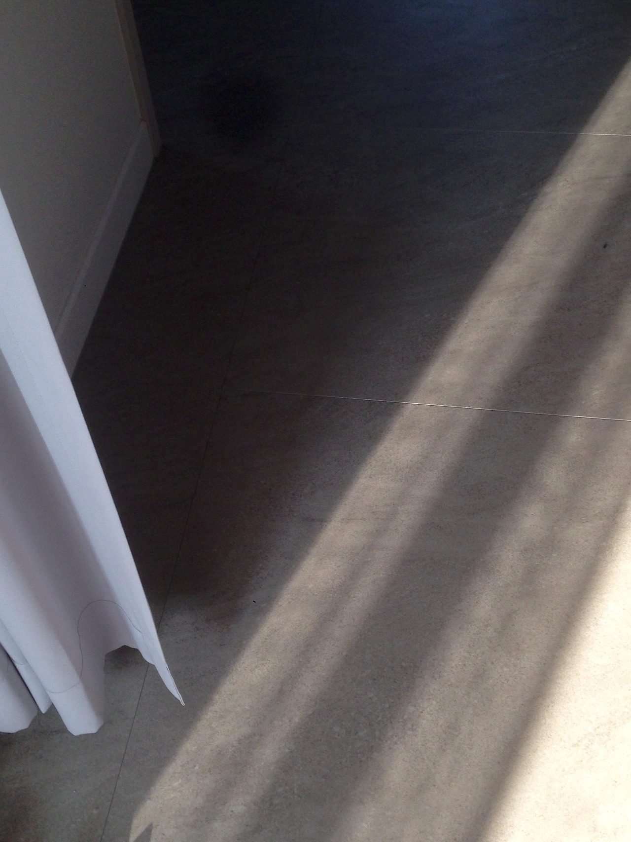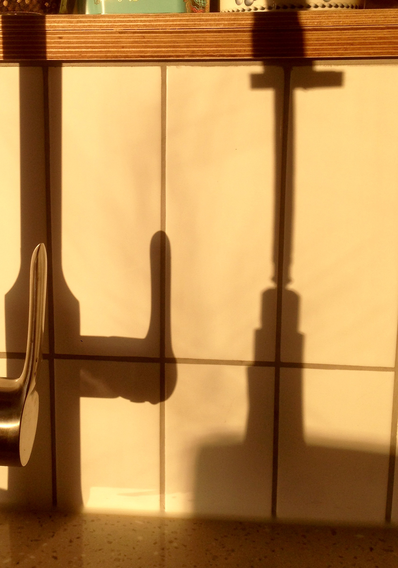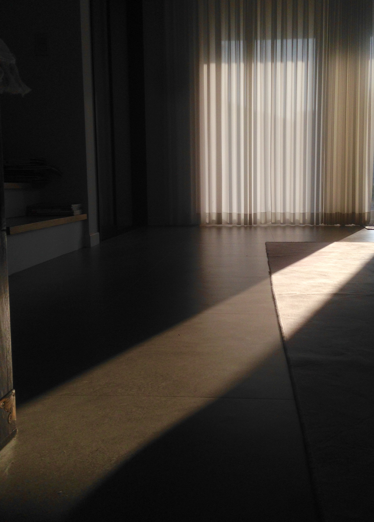 계절과 날씨와 시간에 따라 빛의 색과 형태, 밝기가 시시각각 바뀌어 움직인다. 때로는 출처도 모르겠어서 어리둥절해지는 오묘한 빛도 마주친다. 우리 집에 가로로 긴 창, 세로로 긴 창 등 다양한 모양의 창이 많아서인지 기이한 빛의 무늬도 가끔 출현한다. 오늘 오후에 발견한 이 빛의 무늬 좀 보시라. 당최 어디서 어떻게 만들어진 것인지 미확인이다. 넌 대체 누구냣!